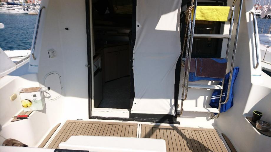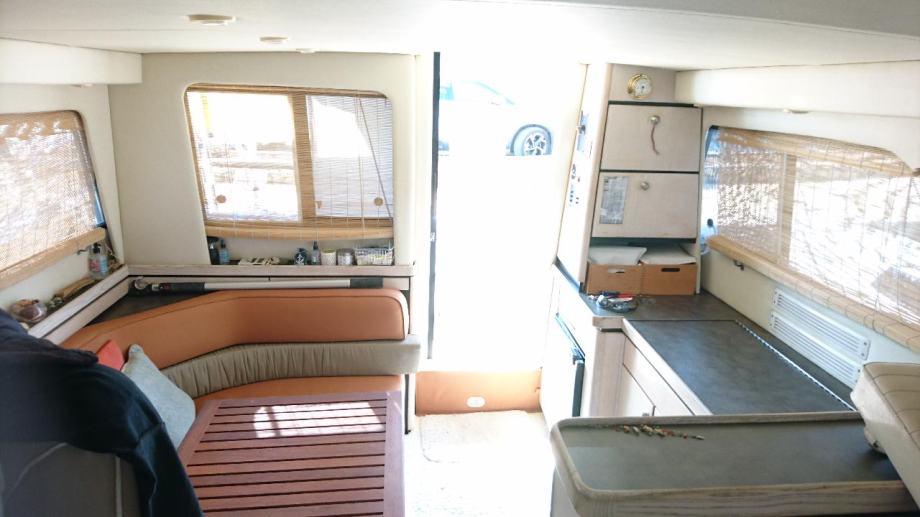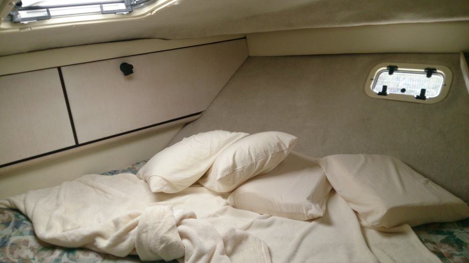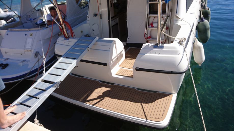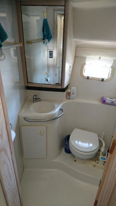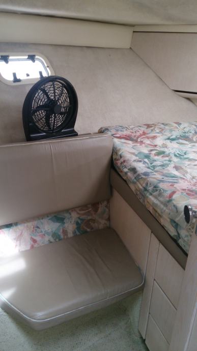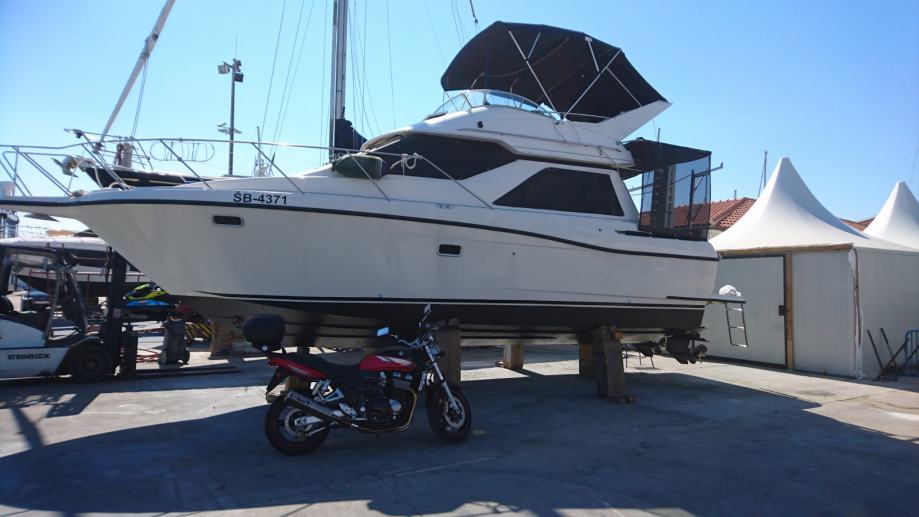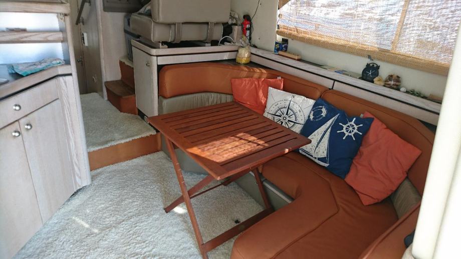 Brod potpuno opremljen za obiteljski godišnji odmor. Dvije kabine sa bračnim ležajevima, kupaonica sa wc-om i zatvorenom tuš kabinom, unutarnji kokpit, salon sa kuhinjom (frižider, sudoper, plinski štednjak...), fly bridge sa tendama. Krmena tenda, svi prozori imaju unutarnja sjenila i vanjske mreže/sjenila, topla voda, krmeni tuš i tuš u kupaonici, razvedene antenske tv i 12V instalacije, ventilatori (nema klime), prije nekoliko godina cijela unutrašnjost je pretapecirana, solarni punjač baterija, tri motorne baterije po 90 Ah + tri servisne baterije po 180 Ah, dva inox tanka za gorivo, tank vode 250 l, crni tank sa maceratorom 250 l, 2 x mercriuser 5.7 L od 184 kW, niti 50 radnih sati nakon remonta, sigurnosno gašenje požara u motornom prostoru, cijela krma je obučena u pluto (corkline), aluminijska pasarela, inox nosači pomočnog čamca (gruje), inox skale za u more, inox ograda na cjelom brodu, muzika alpine (sa daljinskim) sa zvučnicima u salonu i na fly bridgeu, led rasvijeta u tendi na fly bridgeu, fish finder, gps, pomočni čamac maestral. Sve je redovno održavano i u funkciji..brod je vlasnički i nikada nije bio u najmu. Brod se nalazi na šibenskom području. Zadnjih par godina brod stoji, te je potrebno napraviti servise motora, koper premaz, zamjenu cinkova i poliranje. Vez nije na prodaju! Cijena nije fiksna. Moguća zamjena za manji brod tipa Merry fisher.