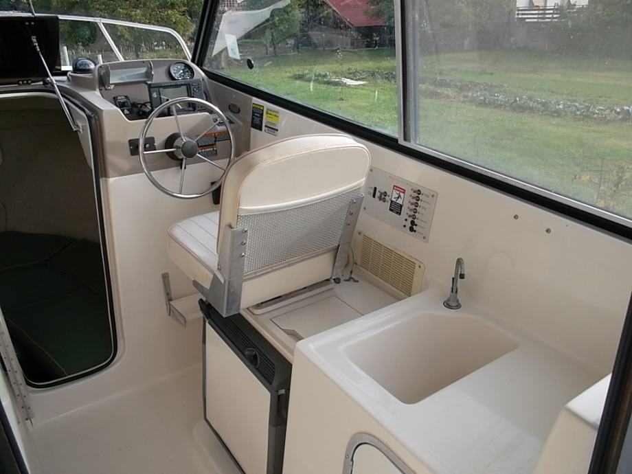 Oprema / Razmještaj : prednja kabina , krmeni ležaj, salon u cockpitu, ukupno 4-5 ležaja, kuhalo, frižider, morski wc u kabini, hardtop sa ulaznim vratima, platforma, ljestve, transom vrata, bazeni za ješku i ulov, sudoper u cockpitu, full opremljen obiteljski fisherman