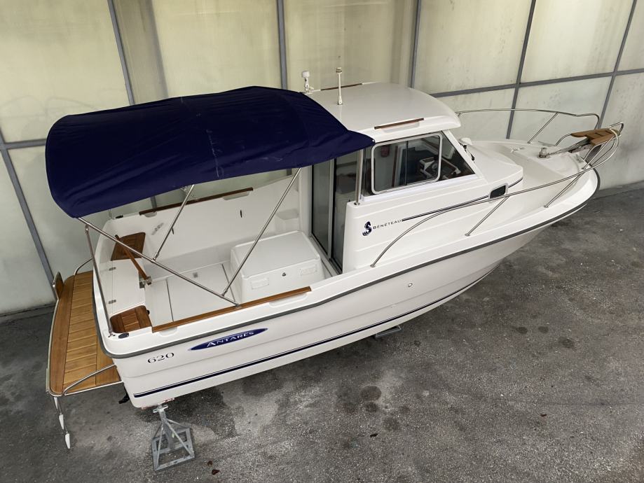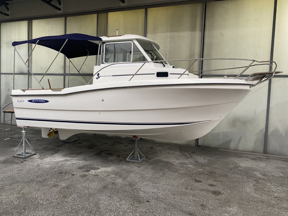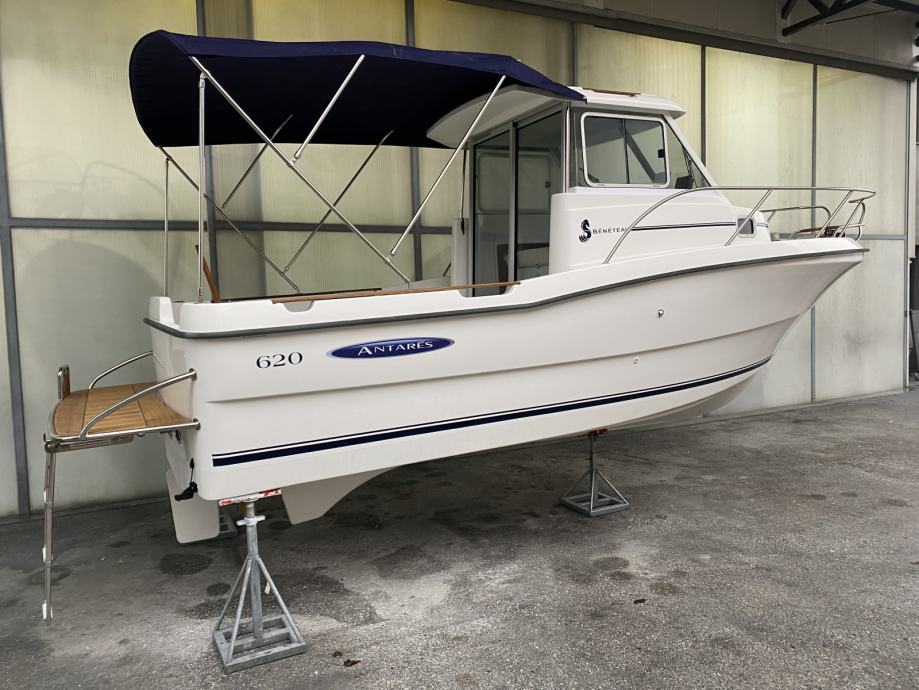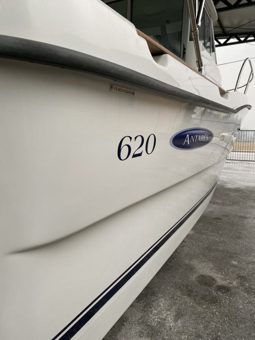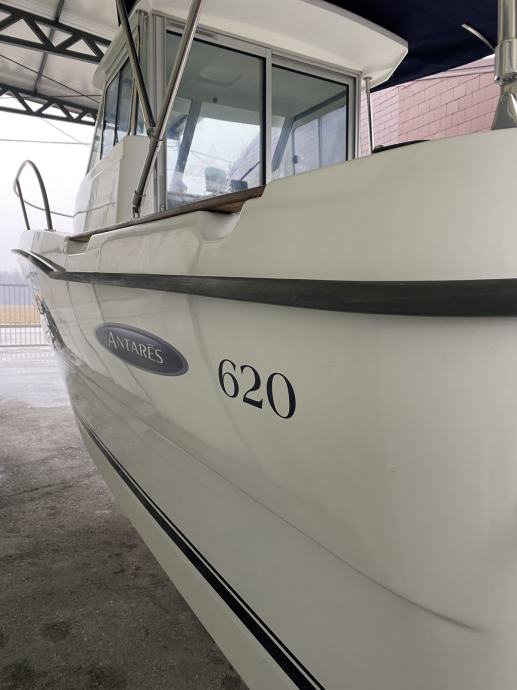 Vrlo uredan i bogato opremljen 2002 Antares 620 sa Nanni turbodiesel 85 hp koji je upravo servisiran i pregledan te je u vrlo dobrom stanju i spreman za korištenje , idealno plovilo za dnevne izlete i ribolov, zatvorena kromilarnica sa kliznim vratima i bočnim kliznim prozorima, duplo skipersko sjedalo ispod kojeg se nalazi sudoper i plinsko kuhalo , komforna kabina za dvije osobe ,