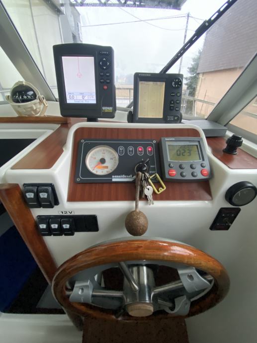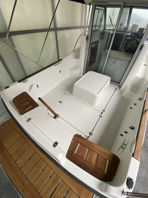 Na plovilo je upravo ugrađena potpuno nova platforma sa teak sa nosačem pomoćnog motora i ljestvama, nova krmena tenda inox, novi pramčani most ,nove klupe u kokpitu,vrlo bogato opremljen sa auto pilot , električno sidreno vitlo , gps , fish finder,inverter 12-220 v 300w komanda u kokpitu, trolling ventil