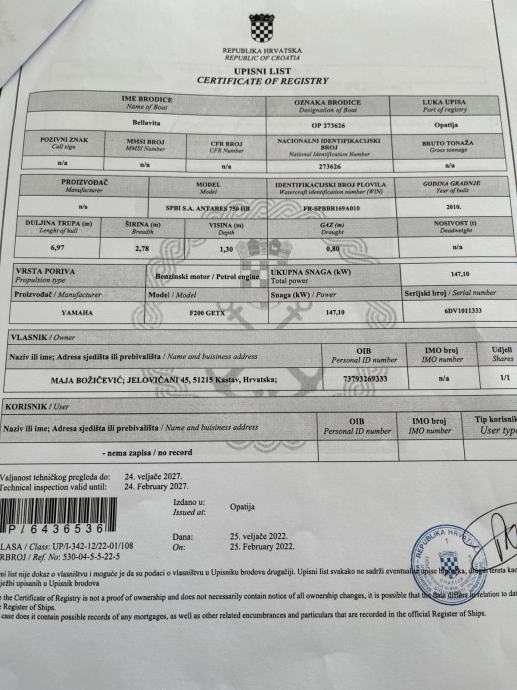 Antares 750 HB s novim motorom Yamaha f 200 GTEX 2019 g sa samo 70 radnih sati pod garancijom.plovilo je registrirano.