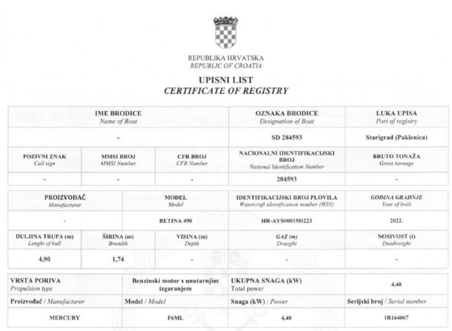 Prodaje se brod Betina 490 prvi vlasnik jako malo vožena. Kupljena u Adriatic Yacht Servis d.o.o. ovlašteni brodograditelj za Betinu u Sukošanu. Prvi vlasnik, očuvana i malo korištena, preko zime na suhom vezu. Penta Mercury 6KS, manje od 10 sati rada, redovito servisirana, garancija još 2 godine na pentu.