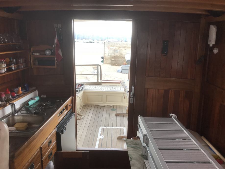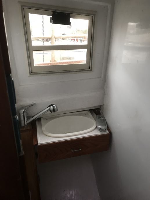 unutarnji prostori: palubna kabina (2 osobe), WC, tuš, 2 bočne kabine (po 2 osobe), komande i kuhinja su integrirani u salon.