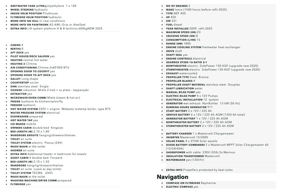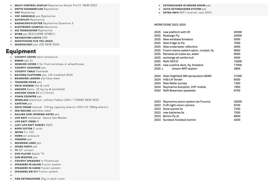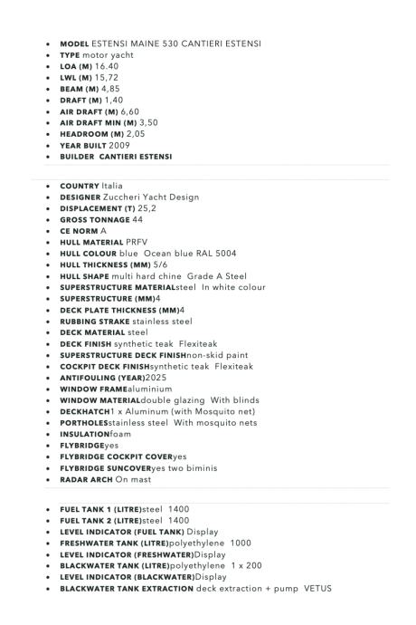 Jedini Estensi Maine 530 na tržištu u odličnom stanju sa velikim investicijama (REFIT 2025) u zadnje tri godine, privatno vlasništvo, nikada u čartera, plaćen PDV. Prodaje se po dogovoru radi kupnje većeg broda. Profesionalno održavan. Zamjena krmenog i pramčenog trastera jačim modelima, kompletno obnovljena boja trupa broda (Nautica Del Delta ITAL 2020 radovi 60000€), kompletna obnova navigacijskih sustava 2022 Raymarine uključujući noćne kamere FLIR (35000€). Generator 13kWh 940h rada, klima uređaj 45000 BTU. Desalinizator obnovljen 2024. Autonomija krstarenja 1500NM. Novi gumenjak Highfield340 sa konzolom i elektro vanbrodski motor 2024, novi Bimini, novi stol fly bridge 2024. Zamjenjene baterije 2023. Svi jastuci i pokrivači novi 2024. Kompletno obnovljena mehanika pasarele Besenzoni. 2023 i 2024 uloženo 80T€. 2025 poroniva platforma, od refita IVECO motora 2025 radili 100 sati, redesign fly, Novi frižideri fly bridgu. Obnovljene sve cijevi i ventili. Fusion stereo sustav cockpit, salon, fly, novi zvučnici cijeli brod. Lounge klupa na krmenom djelu fly bridga nadograđen 2025. EPIRB. Radovi 2025 120T€. Tehnička kontrola Hrvatski Registar brodova 5/2025 vrijedi do 5/2030. Za dostavu detaljnih informacija pošaljite upit na tomstojan@me.com ili zovite na mobitel 0041796875229.