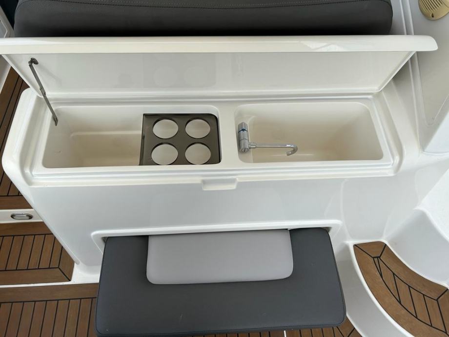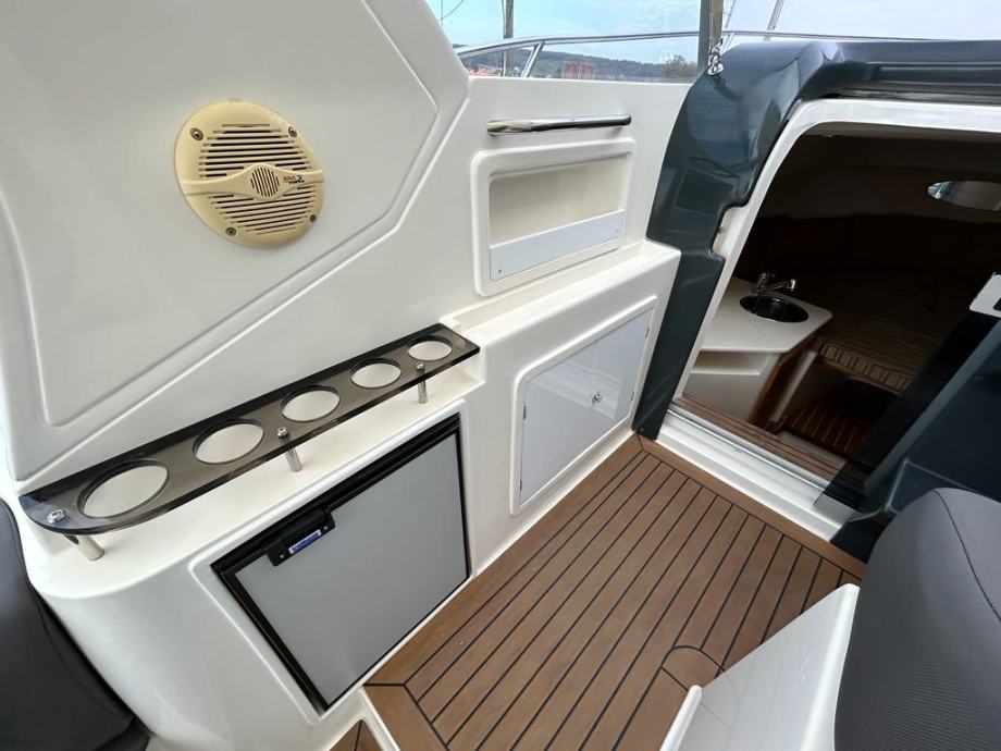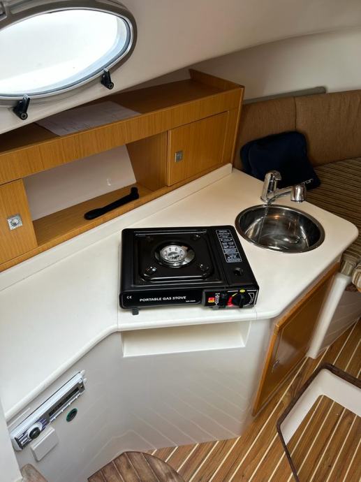 Kompletno opremljen sa električnim sidrenim vitlom + inox sidro , obalni priključak na 220 V sa punjačem baterija ( nove baterije 11/2022 ) , bojler tople vode + topla voda preko motora kada brod nije na obalnom priključku , morski wc , umivaonik , tuš topla voda u kabini i kokpitu, plinsko kuhalo , potpuno novi isotherm hladnjak ( 11/2022 ) , Garmin Gpsmap 720 touch , Boss audio ozvučenje , električno podizanje poklopca motora , veliko pramčano sunčalište , krmeno sunčalište , kokpit salon sa teak stolom , wet bar u kokpitu sa sudoperom i ice box , umjetna tikovina u kokpitu i na platformi .Intregriran pramčani most sa stepenicom za ulazak , intregirana krmena platforma.