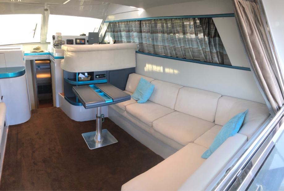 Ferretti je iznimno luksuzan i prostran brod za 4 osobe, odličan za 6 i jako dobar za 10 ako neće svi spavati na brodu. Ima veliki salon sa barom, 2 kabine i 2 kupaone, izdvojenu kuhinju i iznimno prostran fly. Uspoređeno sa najnovijim brodovima Ferretti je superioran po pitanju rasporeda interijera. Sva ta kvaliteta i izvrsno stanje ima za posljedicu zadovoljstvo i osjećaj sigurnosti u plovidbi, a mir u vrijeme kada brod nije u plovidbi. Svojom veličinom dovoljno je komforan, a da ipak stane u većinu hrvatski vala i lučica, preko svega ima gotovo 13 m što se osjeti u prostoru i slobodi kretanja po brodu. Širina od 4 m veselje je u svakom pogledu.