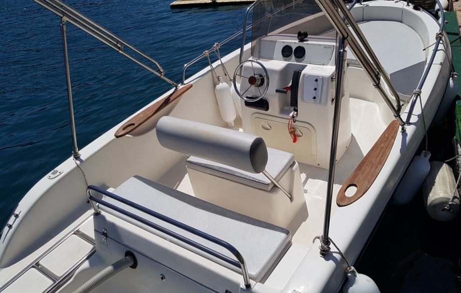Od opreme ima inox bimini sa tendom, komplet jastuka starih 2 godine, pumpa santina, centralno smješten rezervoar goriva 70l sa pokazivacem razine, navigacijska svjetla, usb radio kenwood sa marine kucistem i cerade ljetnu i zimsku za prekrit cjeli brod.