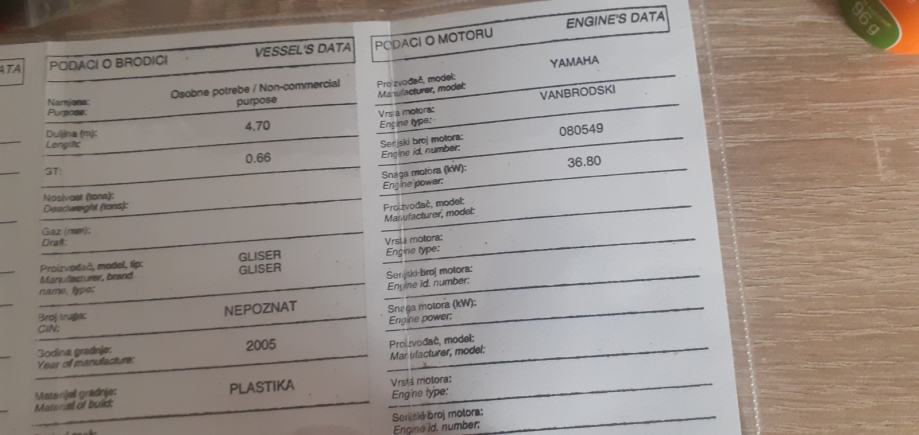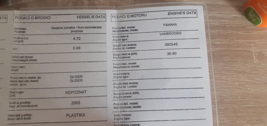 Gliser ima: tendu, navlaka za zaštitu motora, navlaka za pokriv samoga glisera, 3 prsluka za spašavanje i prikolica