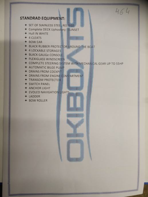 Na slici možete vidjeti službenu kompletnu standardnu opremu plovila Barracuda, proizvođača Okiboats.