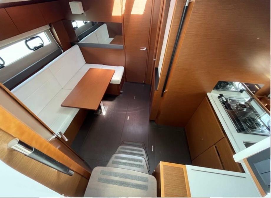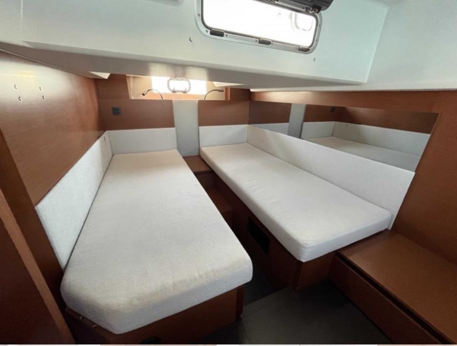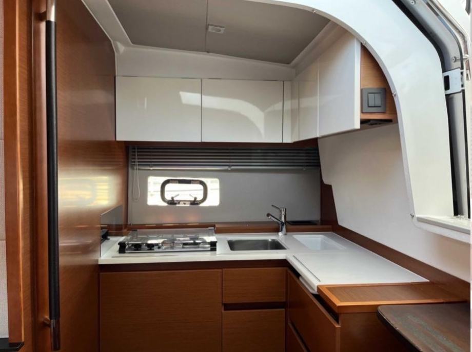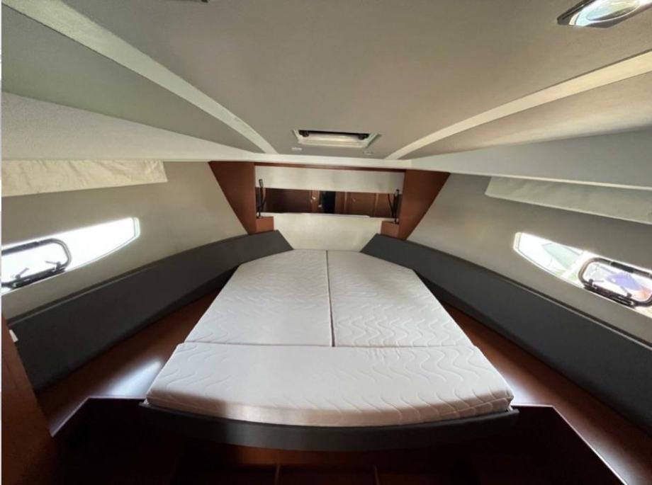 Unutrašnjost: 2 dvokrevetne kabine + salon u obliku slova L, kuhinja (s toplom/hladnom vodom pod tlakom, plinski štednjak s 2 plamenika, hladnjak 130 L…), 1 kupaonica s električnim WC-om i tušem, grijanje na dizel s toplim zrakom, mnogo prostora za pohranu, zavjese i rolete…