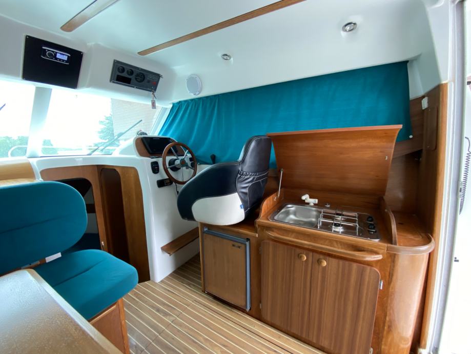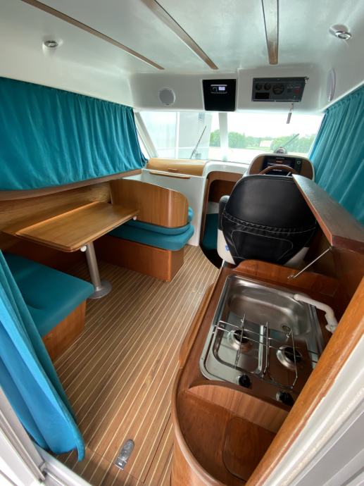 Prekrasan obiteljski brod , vrlo komforna kabina sa 4 ležaja, kuhinja, wc prostorija, velik kokpit za sportski ribolov, sunčalište na flybridge, plovilo je kompletno opremljeno ,Simrad autopilot sa daljinskom komandom, električno sidreno vitlo quick,Novi Humminbird Helix 9 GPS-Fishfinder, VHF, Fusion ozvučenje,, obalni priključak na 220 v , punjač baterija,zatvorena wc prostorija sa umivaonikom i tušem, intregirana platforma sa tikovinom, potpuno novi bimini top , plinsko kuhalo, frižider, intregirana klupa u kokpitu, sistem pranja kokpita morskom vodom za ribolov.