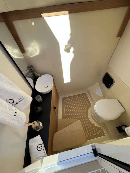 Prostori ispod palube dizajnirani su tako da nude velikodušnu kupaonicu s tušem, WC-om i garderobom. Vlasnik također može odabrati konfiguraciju s dodatnim bračnim krevetom.