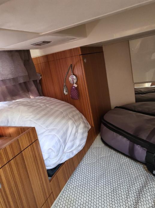 Pramčana kabina + nadstrešnica, kabina za goste svaka s klimom, tikovina na cijelom brodu, električni WC + umivaonik + tuš, Alcantara presvlake