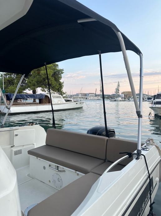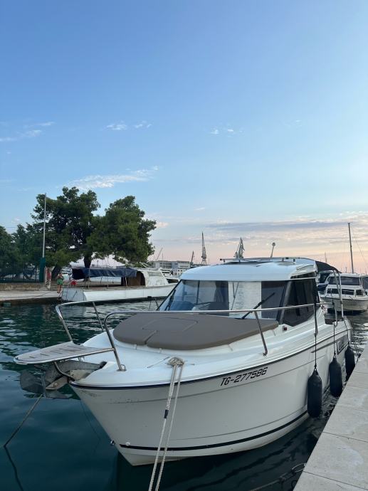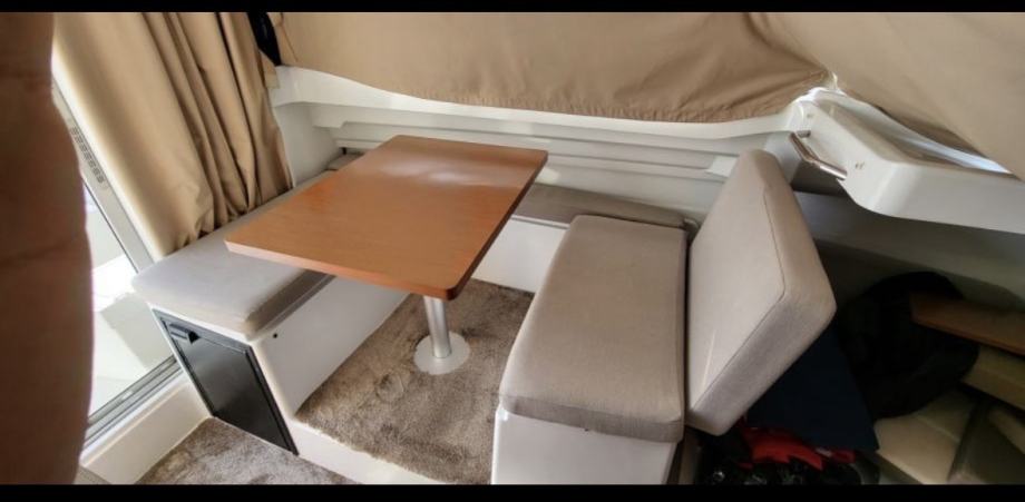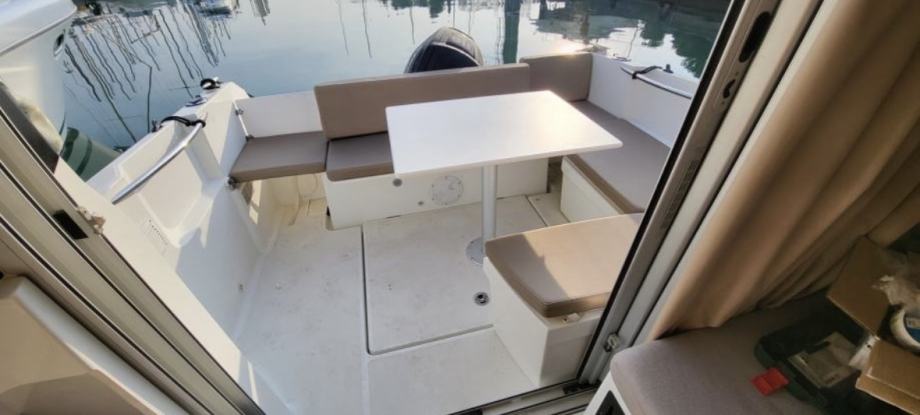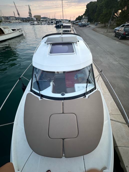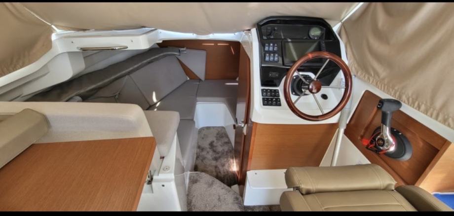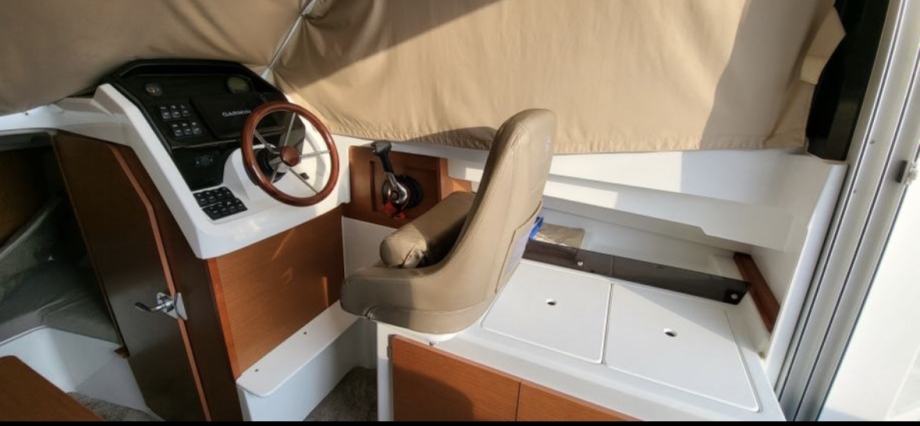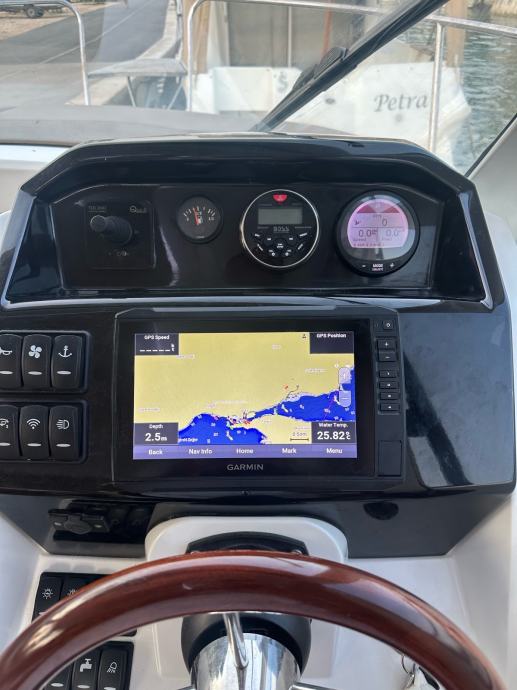 S opremom: bow thruster, elektricni vinc, spirun, kompletni jastuci unutarnji i vanjski plus suncaliste, električni wc prostorija sa crnim tankom, gps ploter fishfinder Garmin 9 incha ekran s kartom Jadrana, tus, rezervoar slatke vode 100 litara, dva sudopera, hladnjak, kompletne zavjese za kokpit,sklopivi bimini za krmu, tepih u interijeru, dva akumulatora, Mercmonitor level 3 digitalni display, solar s victron regulatrom (bluetooth), boss audio zvucnici (bluetooth)...