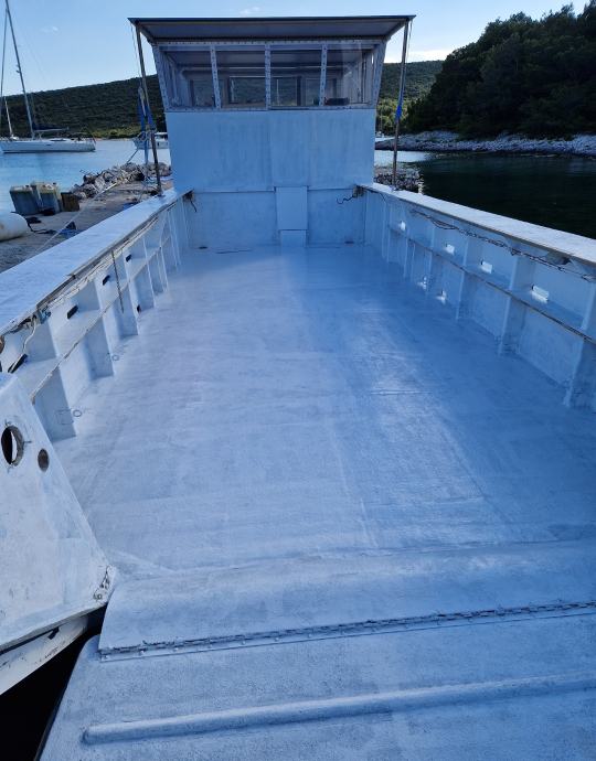 Teretni dio je cca 9 m x 3m 27m2, nosivost broda max do 8 tona. Pogodan za sve svrhe.. dostava, ribolov , turizam, ronioce, gradnju po otocima.. itd.