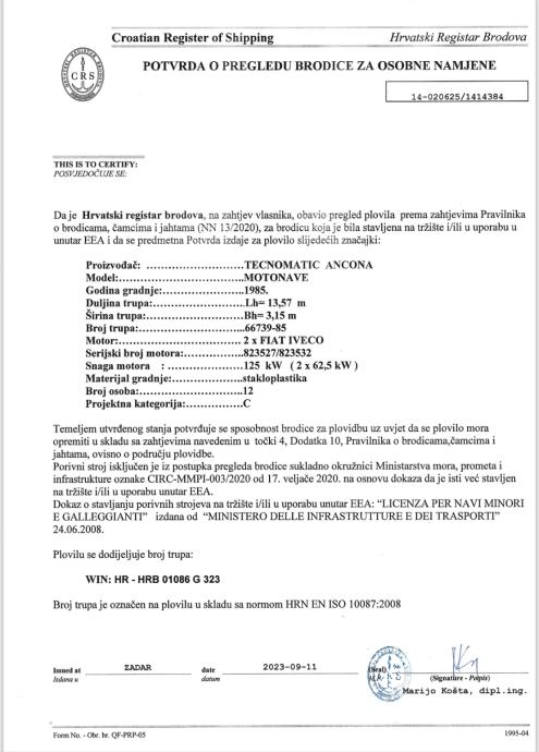 Brod je građen iz stakloplastike. Duzina 13.57, sirina 3.15 gaz 50cm. 2 x iveco aifo po 270KS sa samo 400 radnih sati. Pogon je 2 x jet .