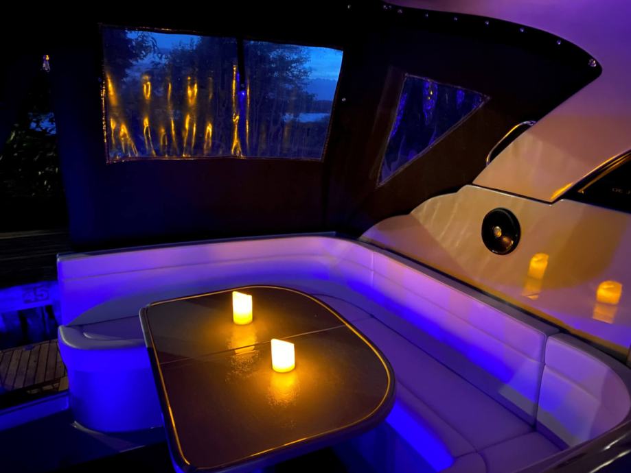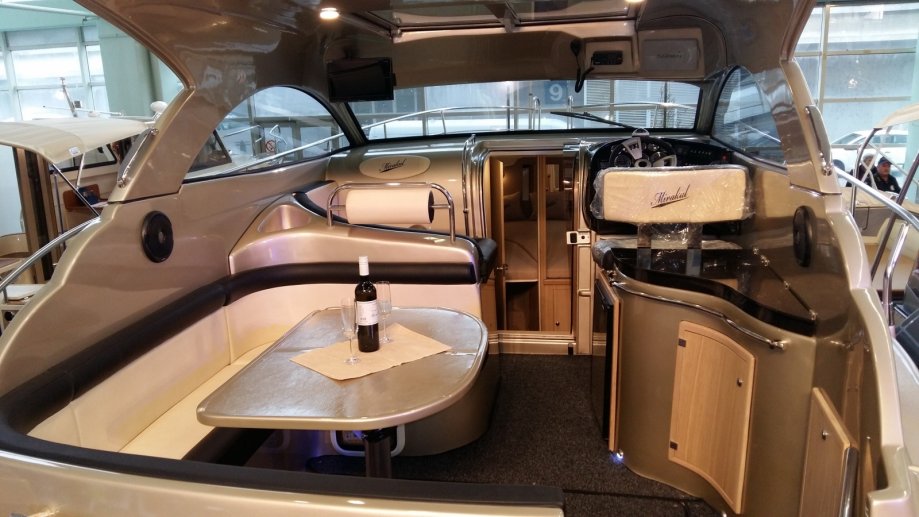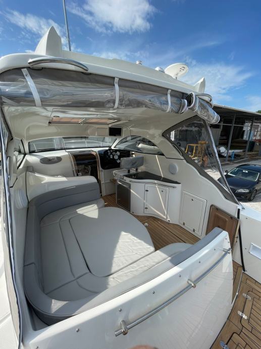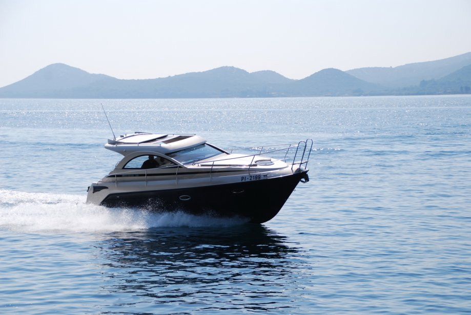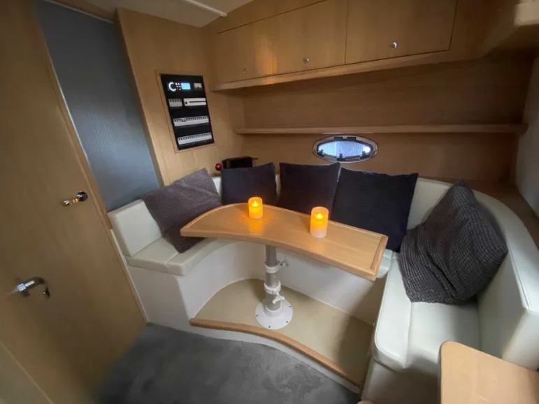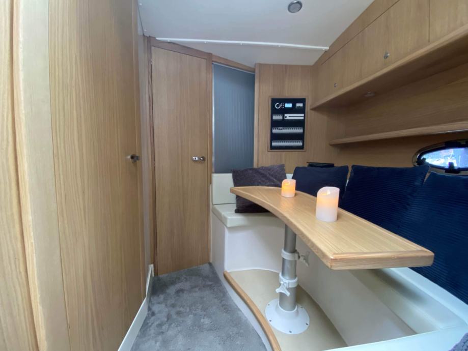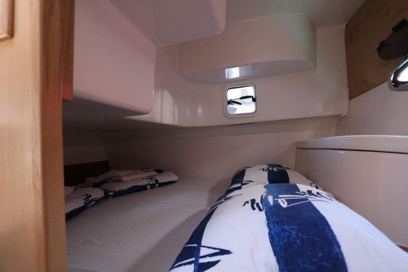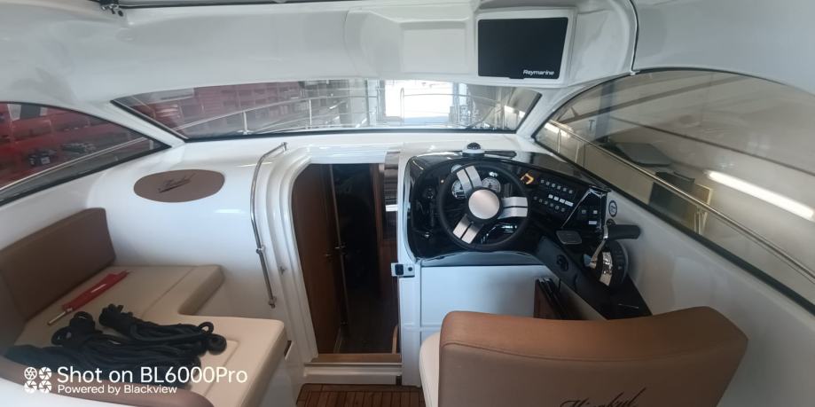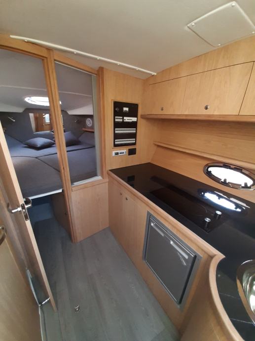 Oprema: tvrdi panorama krov električno sidreno vitlo + duple komande na pramcu, električni flapsovi, priklj.za struju 220V + punjać akumulatora, Marine radio USB, + marine zvučnici, mokri bar u kokpitu (integrirani hladnjak u kokpitu, kuhalo, sudoper ), 2 kabine sa duplim ležajem, salon, kupaonica, stol u kokpitu podesiv po visini ( dodatni ležaj za dvije osobe) ,integrirana platforma za kupanje, ljestve za kupanje, tuš na krmi.