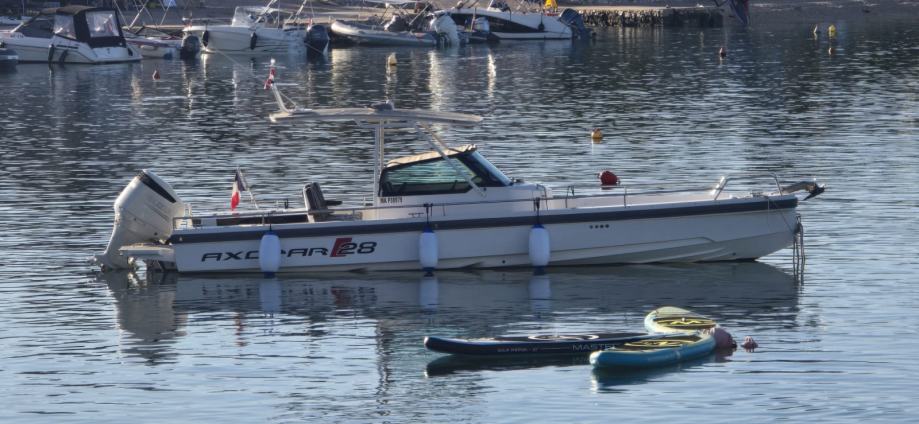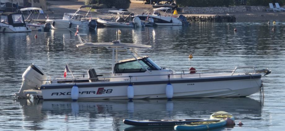 Axopar 28 T-Top je elegantno i stilsko plovilo s osupljivim modrim trupom i sivim plamenom, koji se dopolnjuje. Model, koji je prevezen u kratkom vremenu, opremljen je motorom do 300 km, ali ima i 40 bodova u vožnji od 27 točaka.