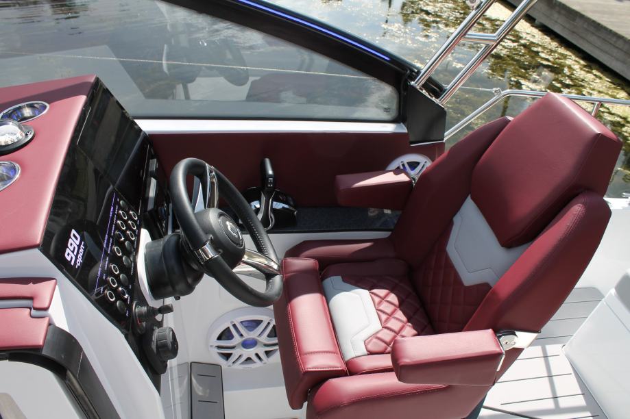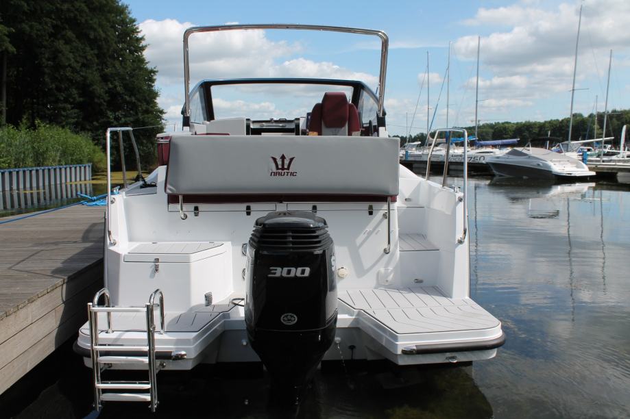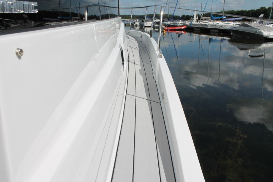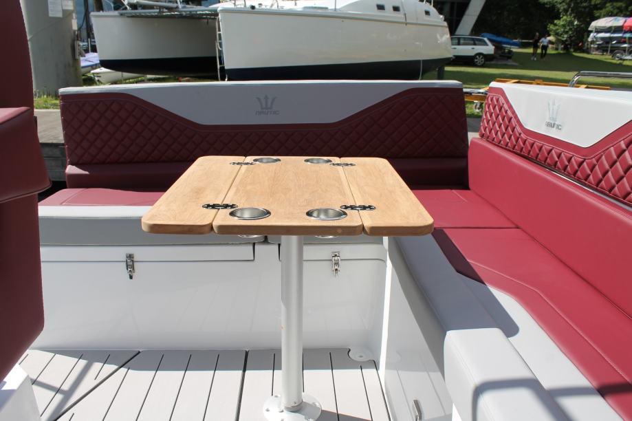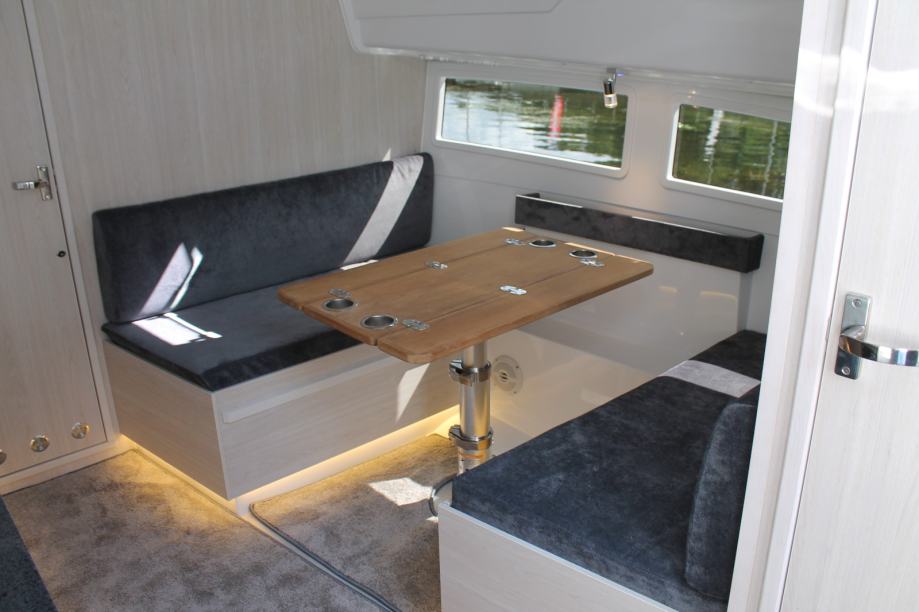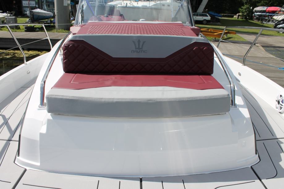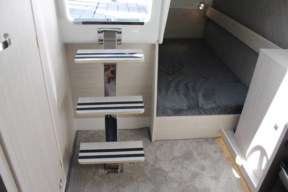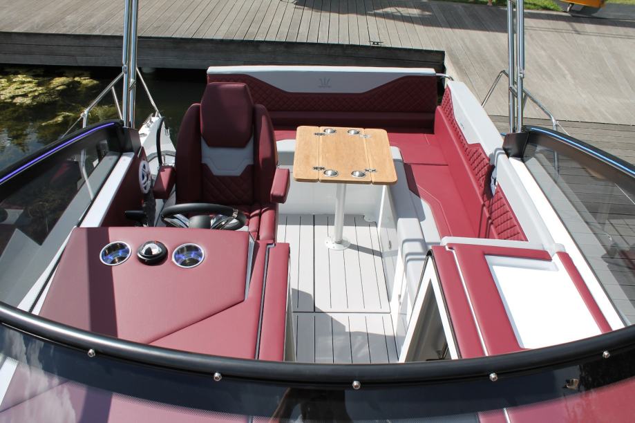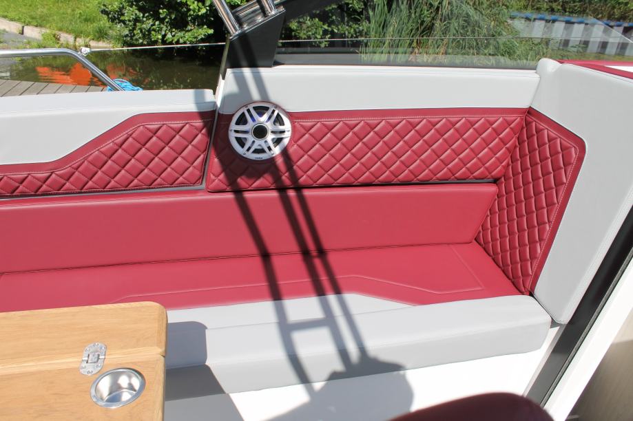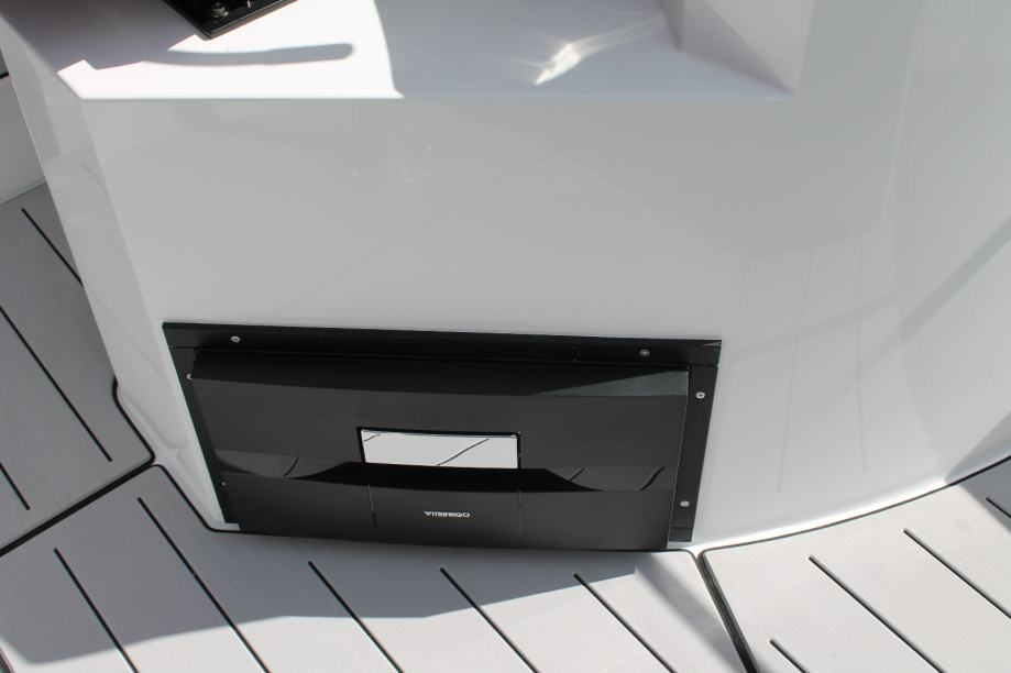 Plovilo je opremljeno bowthrusterom, flapsovima, sustavom tople vode, kuhinja , 2 frižidera od 60 L i 20 L, Bimini tenda, Pramčana klupa i sunčalište, Smart TV, pregrađena pramčana kabina, el. wc, tepisi u salonu, vendeck palubna obloga , podesivi upravljač, Garmin 12" ploter, ambient rasvjeta, elektirčno sidreno vitlo, stolovi od tikovine, stalak za šampanjce 6 kom.
