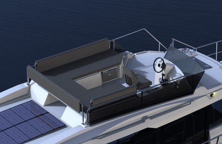 - Integralni bijeli krov iznad kokpita, salona i kormilarnice s integriranim stepenicama do sunčališta