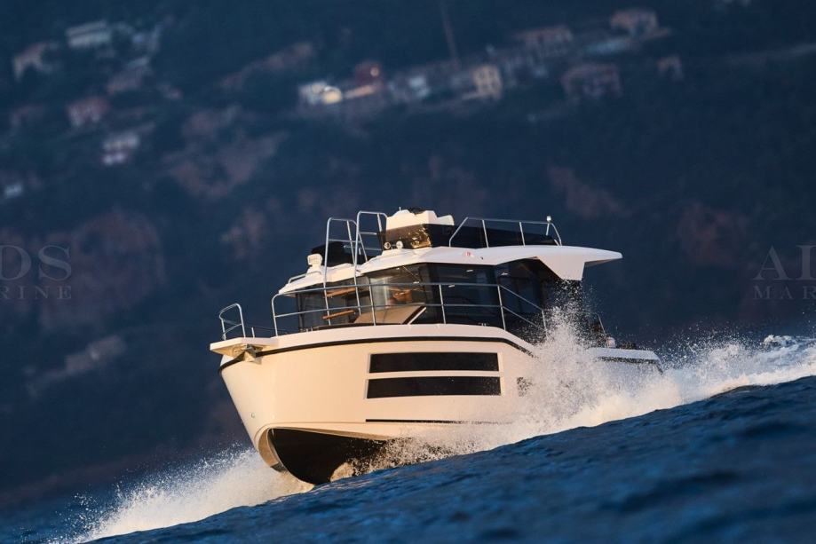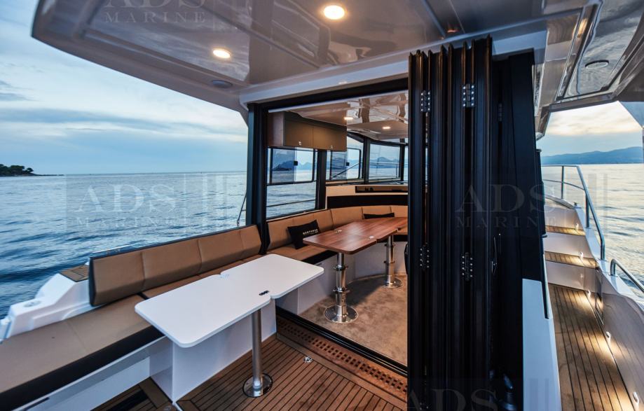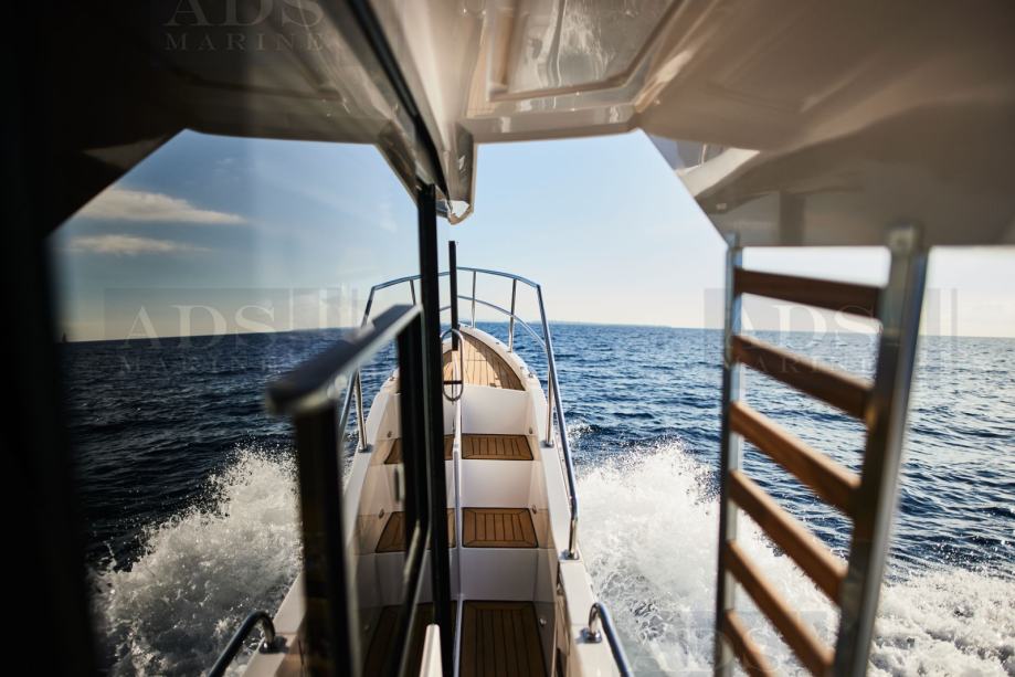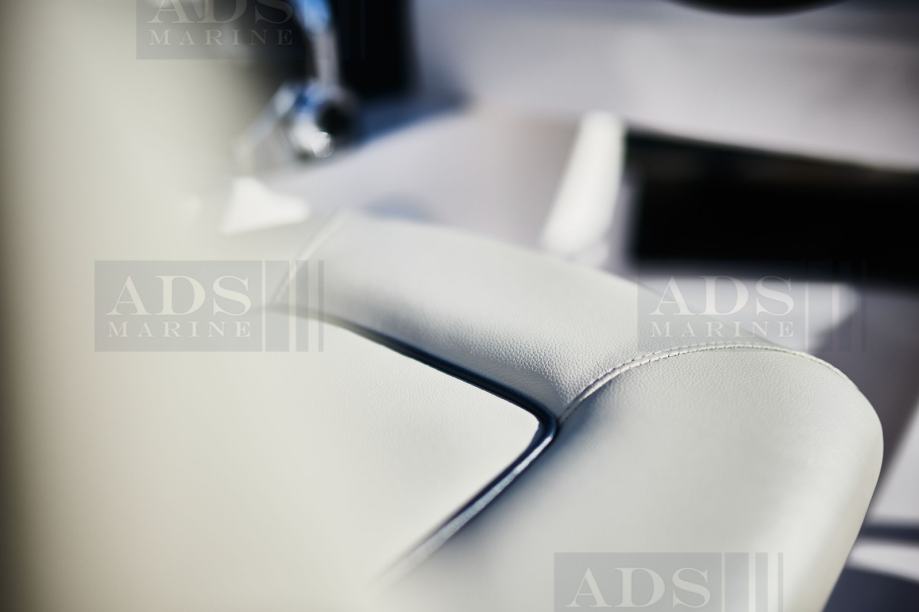 Fly-bridge uključuje: podesivu kormilarsku stolicu, volan, zaklopka za gas, dvostruku USB utičnicu, upravljačku ploču thrustera (pri odabiru thrustera)