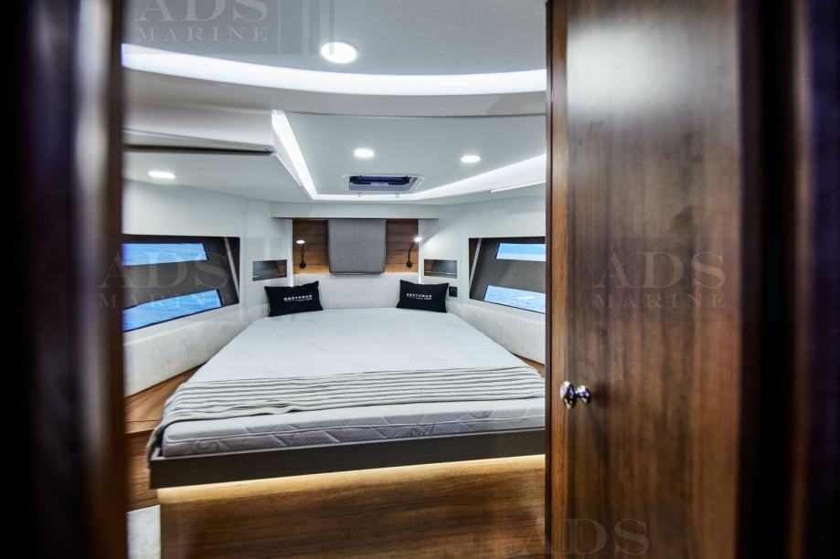 -Pramčana glavna kabina s king size krevetom, dva fiksna prozora s roletama, mali ormar na desnom boku, stropna rasvjeta s dimerom