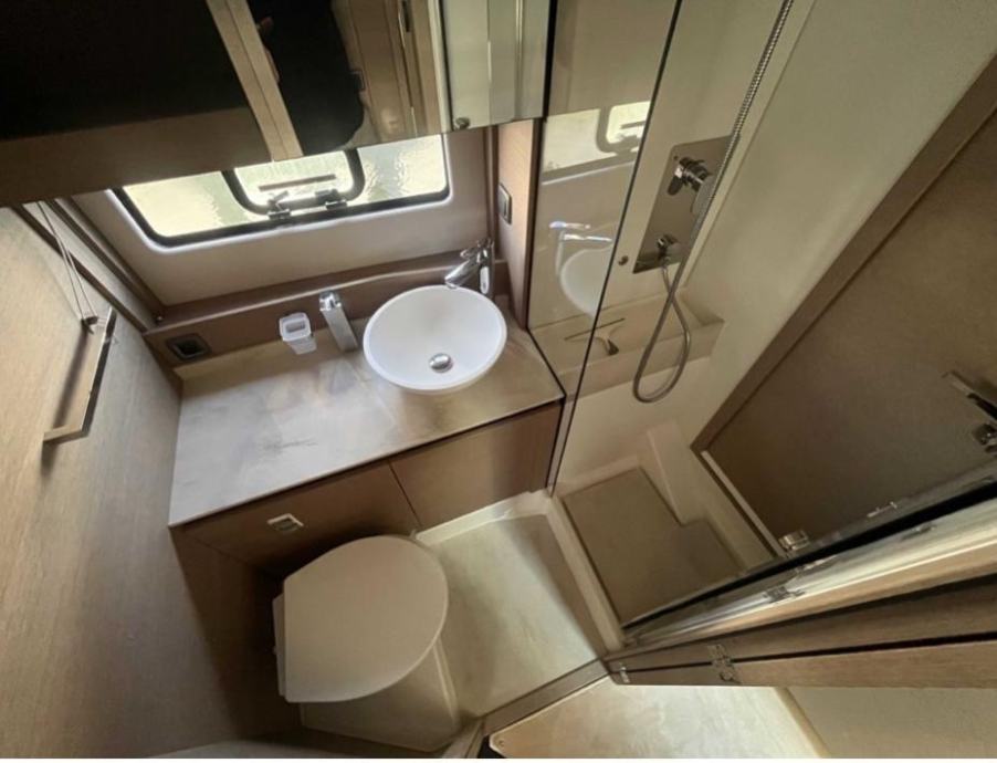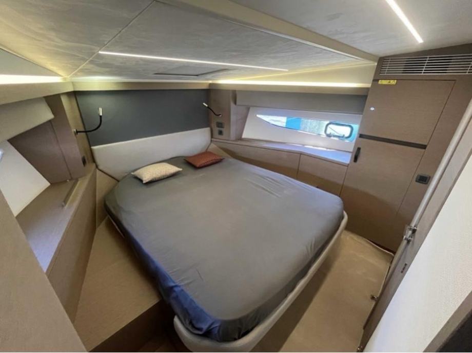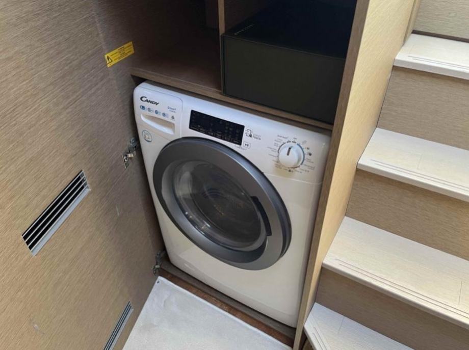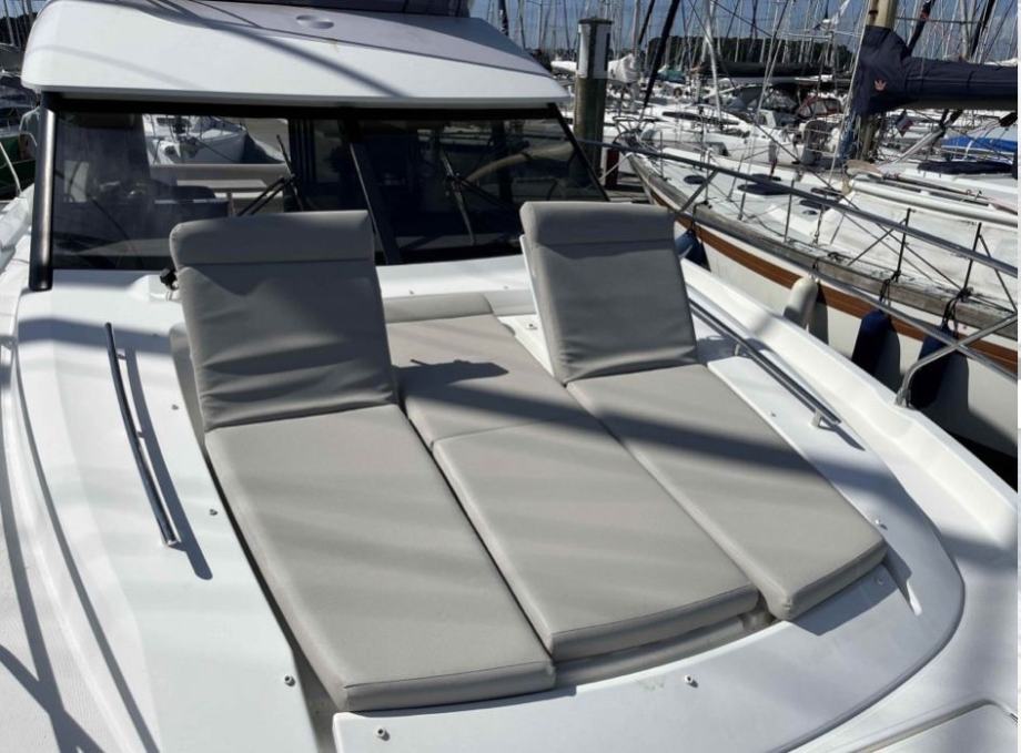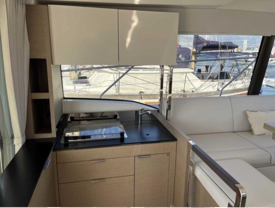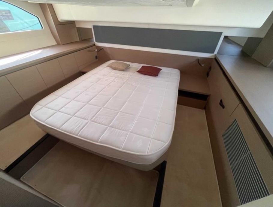 Unutrašnjost: Drvena unutrašnjost u sivom hrastu, 1 vlasnička kabina, 1 kabina za goste, 1 kupaonica, kuhinjski kutak (s jednim sudoperom s toplom/hladnom vodom pod tlakom, plinski štednjak s 2 plamenika, hladnjak, bojler 40 L, tropska klimatizacija 40.000 BTU, perilica/sušilica rublja kapaciteta 5 kg)