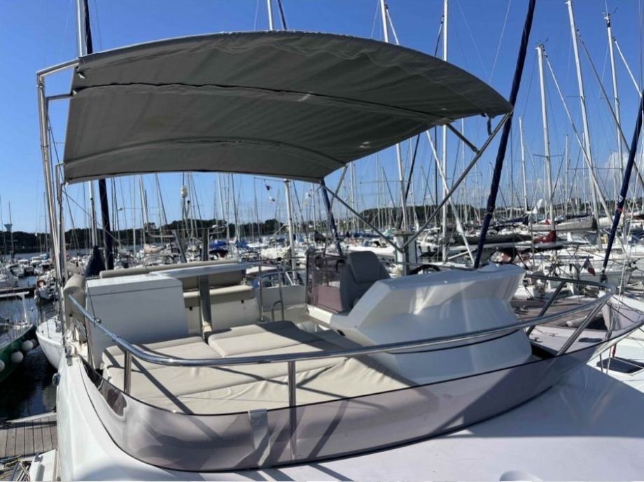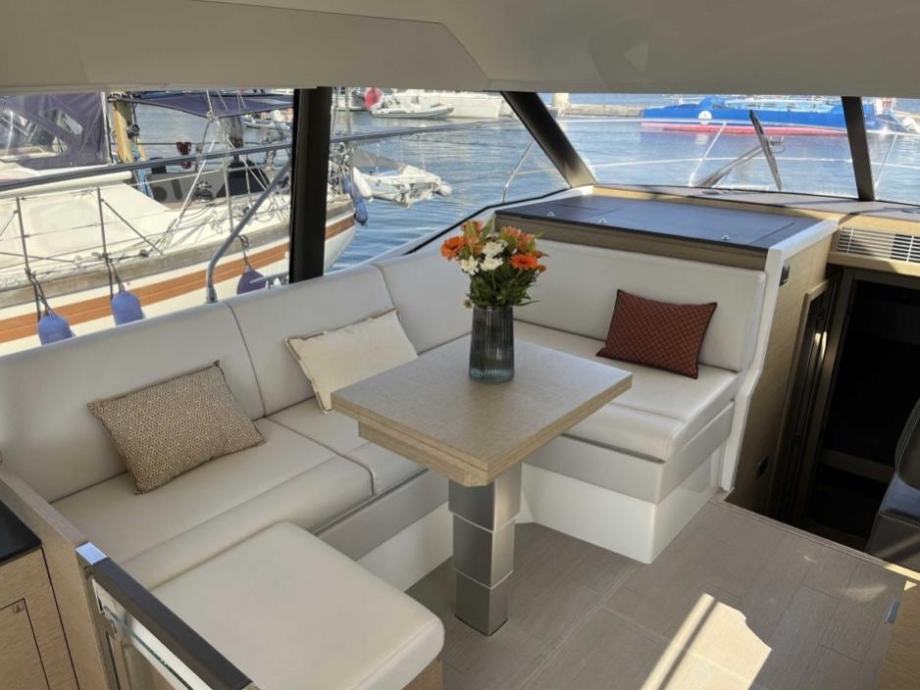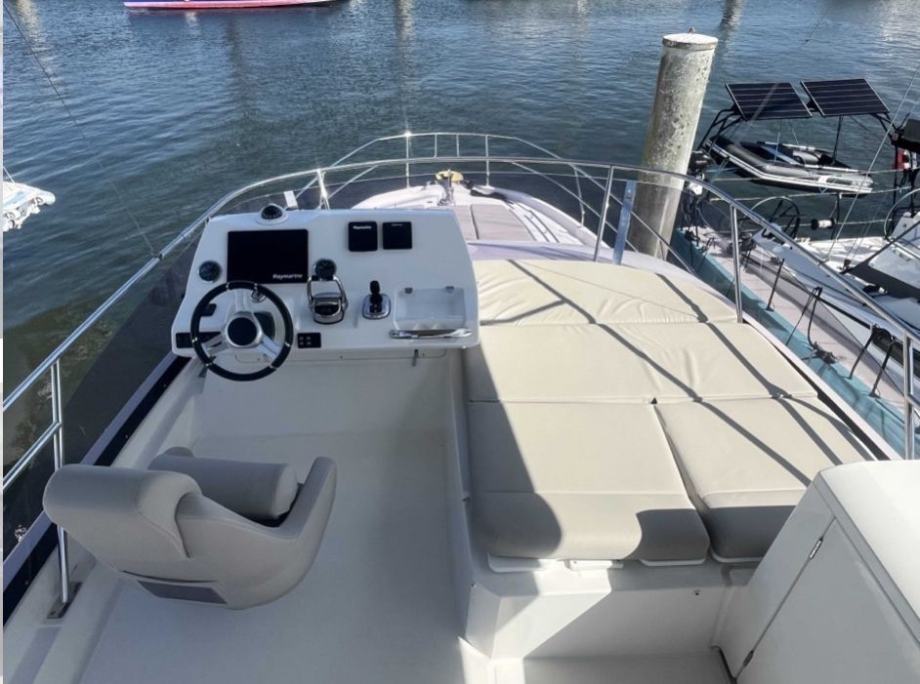 Eksterijer: Verzija s flybridgeom, joystick na flybridgeu, kokpit + krmena platforma obloženi tikovinom, tikovinski stol u kokpitu, vanjski tuš, sunčalište na pramcu i na krmi, cerada za zatvaranje kokpita, bimini na flybridgeu, kuhinja na flybridgeu s hladnjakom, električna tenda u kokpitu, zaštitne navlake za komandno mjesto na flybridgeu, rezač konopa na osovinama