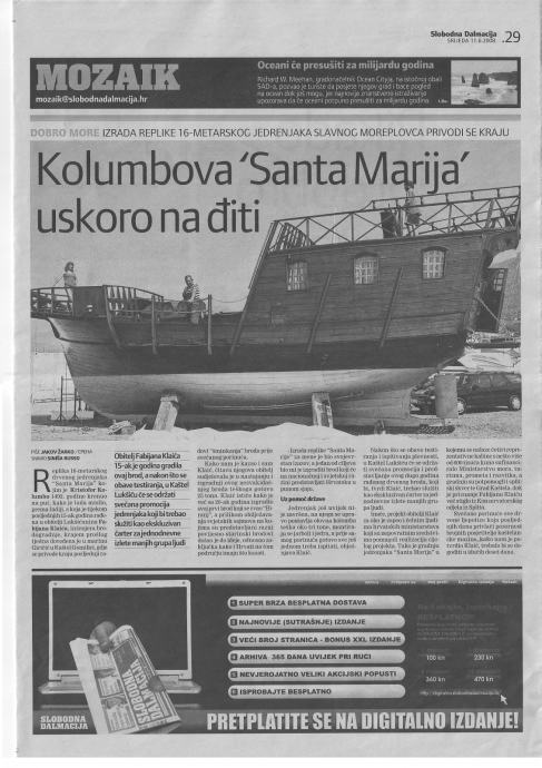 Prodajem drveni tradicijski brodm tipa karaka iz 15.stoljeća koju sam projektirao i izgradio u svome "škveru" (2008-2011.g.) te je namjenjen za gospodarske svrhe. Brod ima veliku tradicijsku vrijednost, proglašenu od brojnih institucija. Brod ima dozvolu za pružanje usluga posluživanja jela i pića te je gusarsko-piratskog karektera. Jahta "Santa Maria Kaštela" registrirana je za prijevoz 12 osoba, registracija vrijedi do 2023. godine. Od 1.1. 2020.g. može biti i brodica za jednodnevne izlete dvanaest putnika plus dva člana posade. Moguća je i registracija broda za 24 i više putnika.