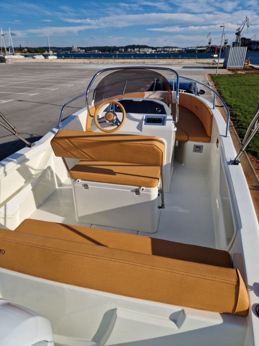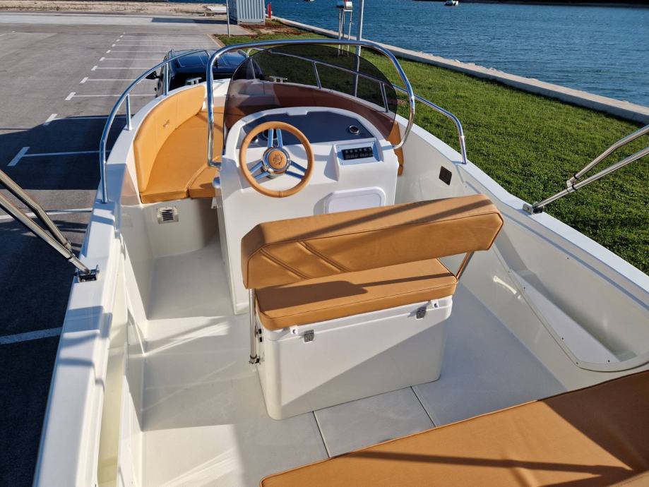 bijela boja trupa | navigacijska svjetla | volan | upravljačka ploča s prekidačima | vodonepropusna električna instalacija | električna sklopka | električna truba | kaljužna pumpa | plinski amortizeri i gumene brtve na poklopcima otvora spremišta | rukohvat od inoxa | inox ljestve na krmi | 4 bitve za privez | set vanjskih jastuka | inox odzračnici | kormilarsko sjedalo | inox naslon s fiksiranjem u 5 točaka | ugrađeni tank goriva 103 litre