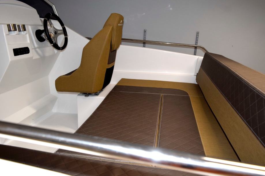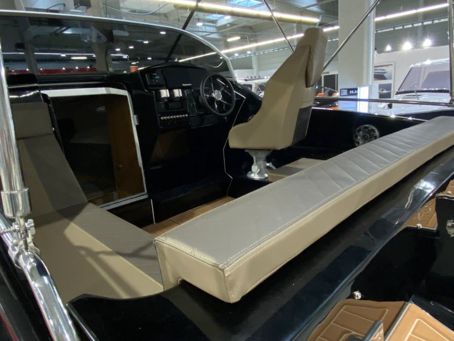 The photos are for illustration purposes only and show additional equipment. Standard equipment includes: white hull, windscreen, anchor locker, four cleats, side rails, stainless steel drains, helmsman's seat, swimming ladder, upholstered seats, cockpit mattresses, rubber fenders, stainless steel fender ends, stern bench and kitchenette with a refrigerator, a small stove and a sink, as well as a toilet with a washbasin.
