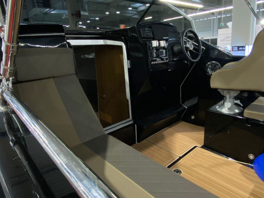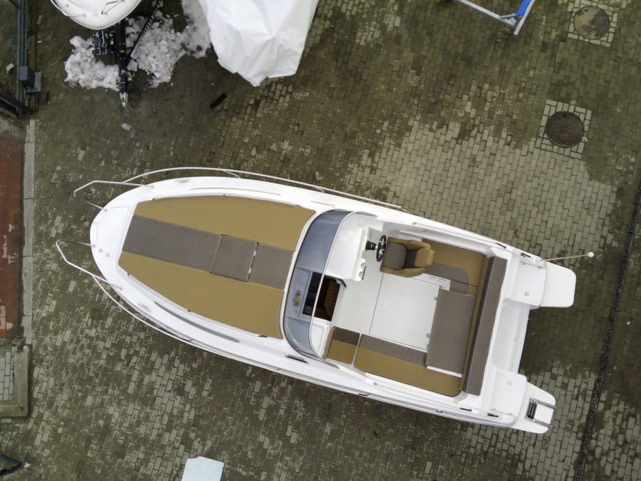 Die Fotos dienen nur zur Veranschaulichung und zeigen zusätzliche Ausstattungsmerkmale. Zur Standardausstattung gehören: weißer Rumpf, Windschutzscheibe, Ankerkasten, vier Klampen, Seitengeländer, Edelstahlabläufe, Steuermannssitz, Badeleiter, gepolsterte Sitze, Cockpitmatratzen, Gummifender, Edelstahl-Fenderenden, Heckbank und Küchenzeile mit Kühlschrank, kleinem Herd und Spüle sowie eine Toilette mit Waschbecken.