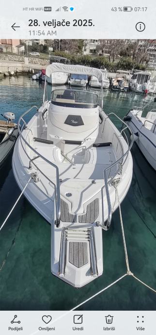Prodajem kvalitetan malo korišten i komplet opremljen brod registriran do 2029 za 9 osoba, korišten za osobne potrebe (nikad rentan). Tank goriva 250L,+30L,Tank vode 80L, tuš, bimini inox, jastuci, vitlo 700w sidro inox sa lancem 8mm, provene i krmene ljestve, cerada, wc, kuhalo, frižider, ploter, dubinomjer, kompas, sirena, pojasevi, pp aparat, prva pomoć, pirotehnika, radiostanica, oprema za privez, bokoštitnici, startno/servisna marine baterija 07/2025g, motorizacija L6 4t 250ks max brzina 42čv, cruise 28čv el. Hidraulično upravljanje. Brod je u moru i spreman za korištenje. Cijena nije fiksna i bez dodatne opreme je 48 000 €