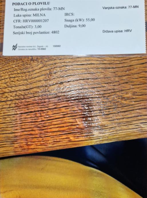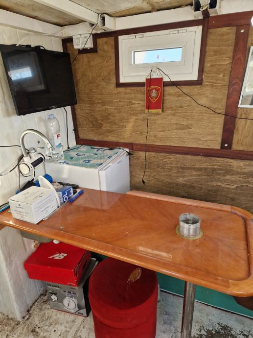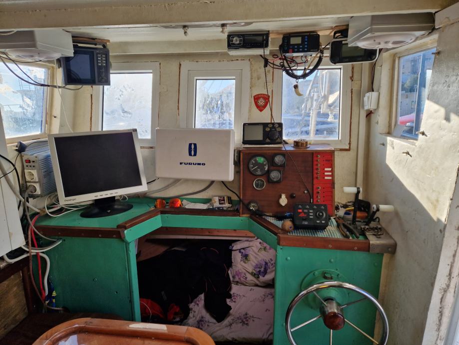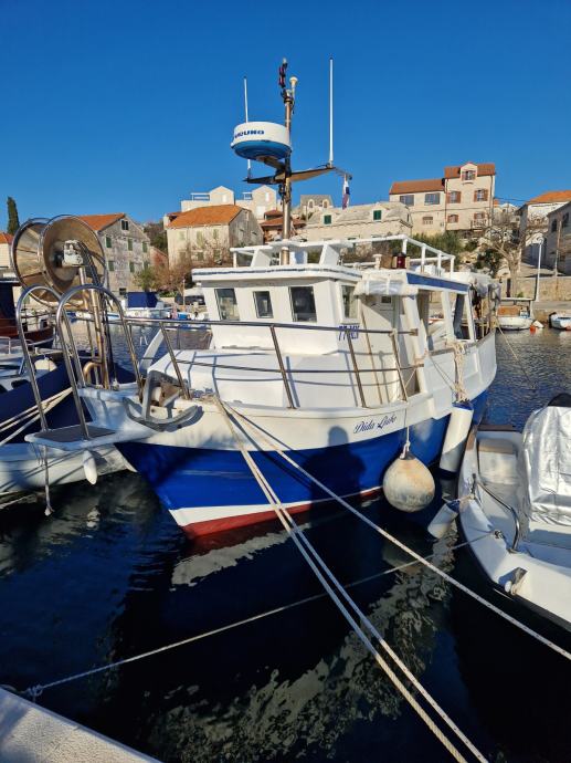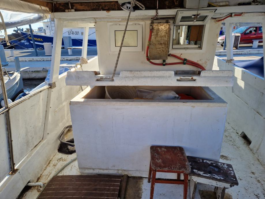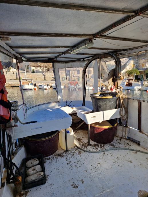 Brod je plastificiran spreman za rad za parangale ima duple komande na krmi i kormilarnici dva lezaja zahod tank vode 300l goriva 1tonu ima jaceru za 50 kaseta plastike vitlo za parangale vitlo za mreze autopilot sonder radio zvucnici frizider spaher zahod jostik na krmi za vozit kad se dizu parangali radar ploter ais pretvarac za struju 220 sidro na provi motor mercedes 150 konja