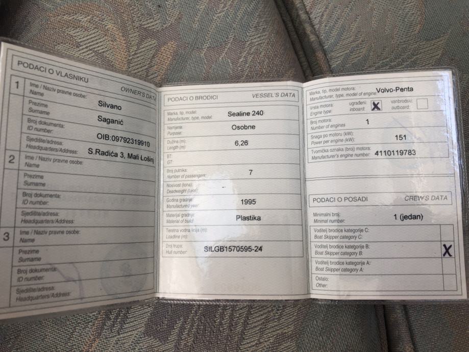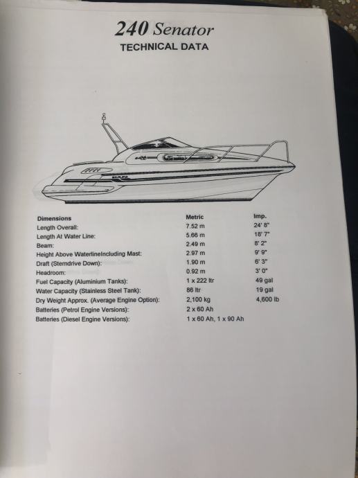 Prodajem Sealine 240 Senator 1995g s motorom Volvo Penta 4,3 GS/DP 200ks uredno servisiran, motor i noga 800 radnih sati. Novi karburator instaliran prije 3 godine. Gliser je u moru 3 mijeseca po lijeti. Gliser je odličan za četvero članu obitelj. 4 ležaja, wc, kuhinja i frizider, dubinomjer, elektricni vinc, nova pumpa vode instalirana prošle godine.. Putna brzina 20nm, max 28nm. tank goriva 200ltr, tank vode 90ltr nova pumpa vode instalirana prosle godine. Po potrebi šaljem jos slika. U gliser bi trebalo ulozit na nove klupe zato je cijena o po dogovoru. Slike su takve da se vidi pravo stanje bez ikakvog šminkanja.