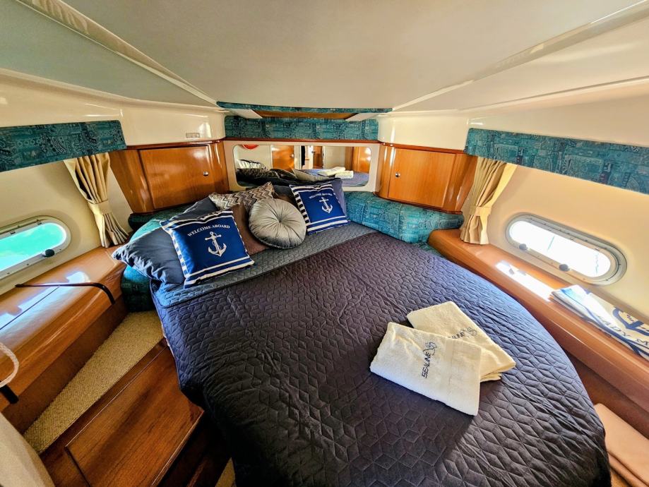 Brod ima 2 kabine (veliku spavacu master kabinu) te drugu u kojoj mogu spavati 3 osobe, salon, kuhinju, te odvojeni wc (nova el. pumpa wc-a).
