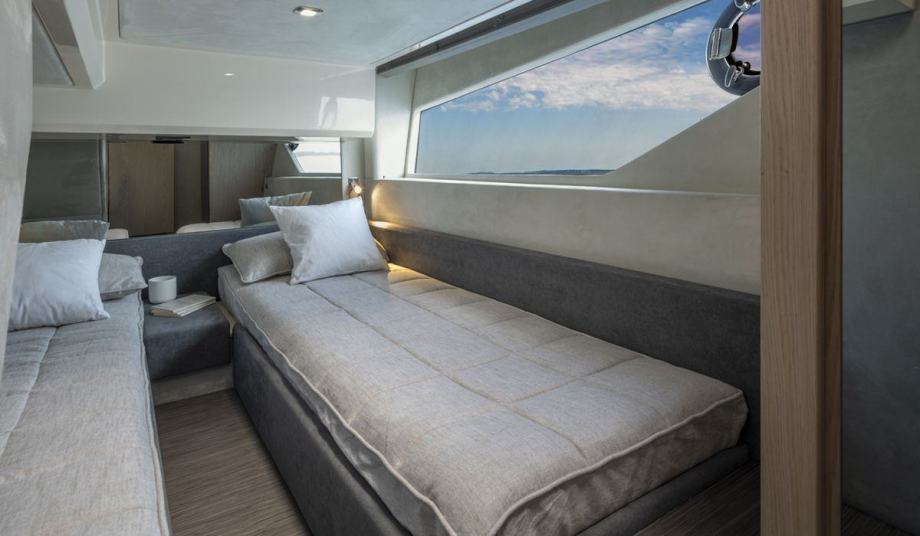 Pod palubom, brod nudi prostrane prostore: tri kabine i dvije kupaonice, sve karakteristične za elegantan i sofisticiran namještaj, pažljivo osmišljen do najsitnijih detalja u skladu boja i linija.