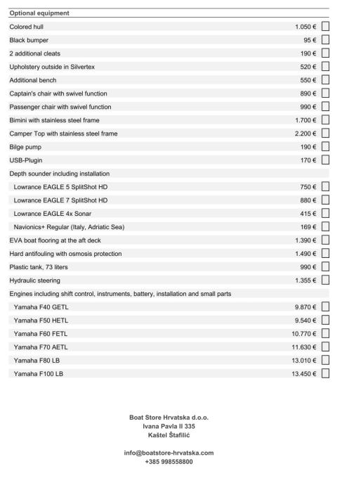 Optional upgrades: colored hull, bimini or camper top, USB plug, hydraulic steering, EVA flooring and Yamaha engines up to 100 HP.