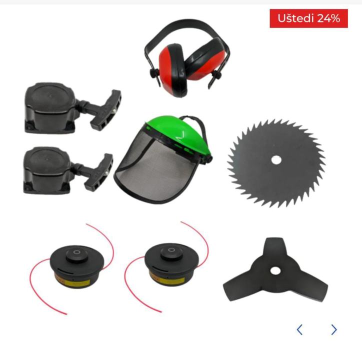 Pribor od 10kom: 1x trimer glava, 2x rezna ploča, 1x zaštitni vizir, 1x uprtač, 1x posuda za mješanje