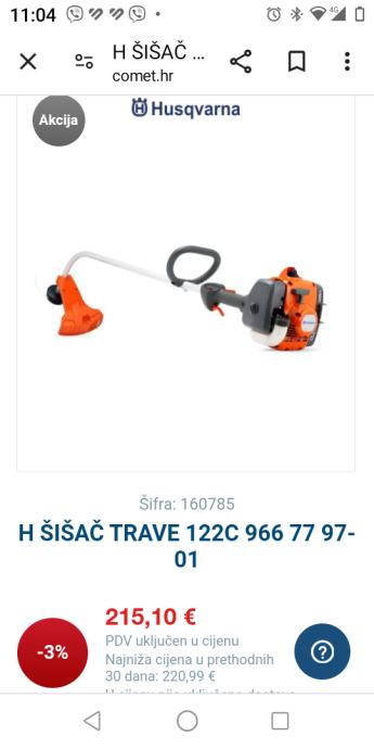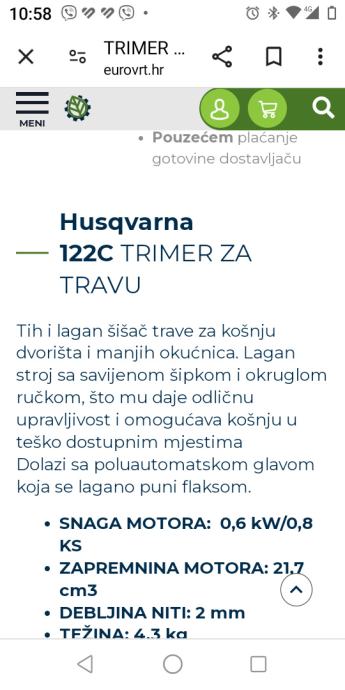 Prodajem trimer Husqvarna 122C. 0.6kw 0.8ks. Trimer je doslovno kao iz dućana. Par puta korišten stoji duže vrijeme ne koristi se. U upotrebi je veći radi košnje velike površine. Stanje vidljivo na slikama.