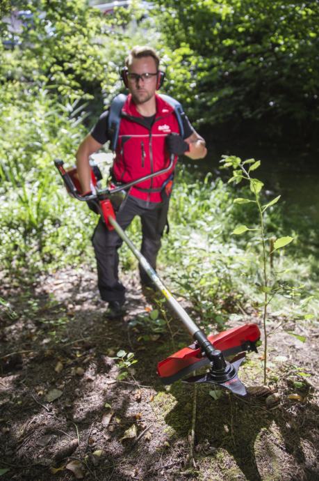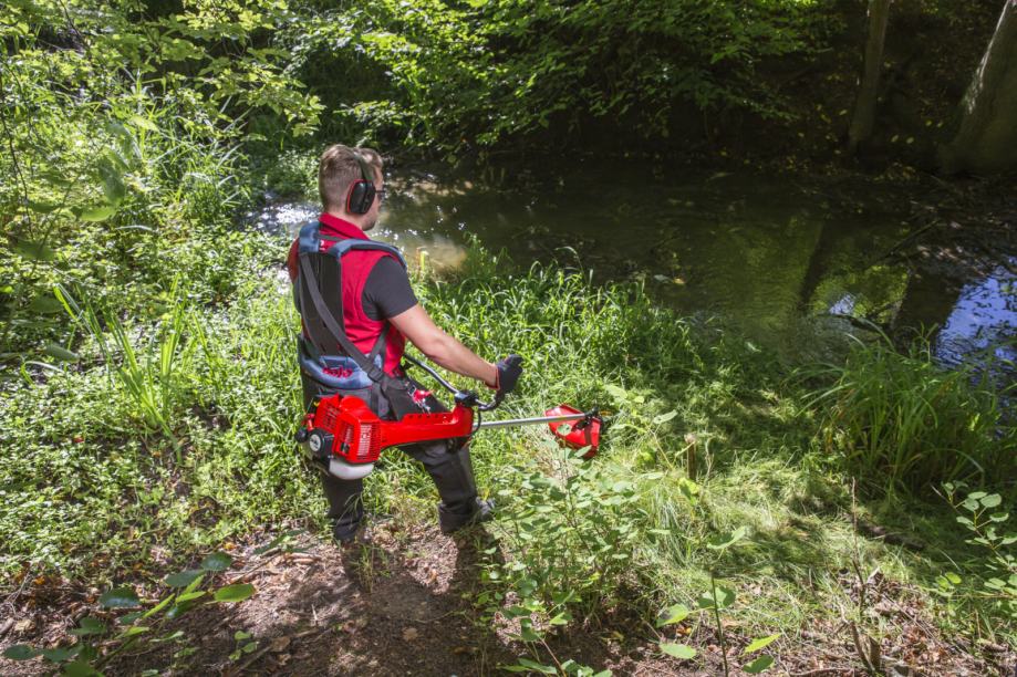 Posebno snažni motor s niskim emisijama, Profi rezna glava, robusni čelični nož i profesionalni dvostruki pojas za nošenje – savršeno za zahtjevne radove.