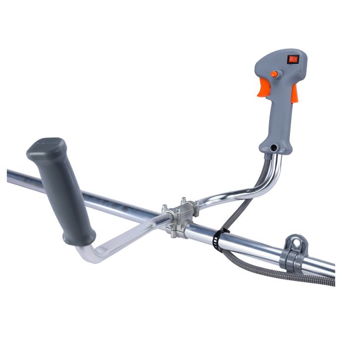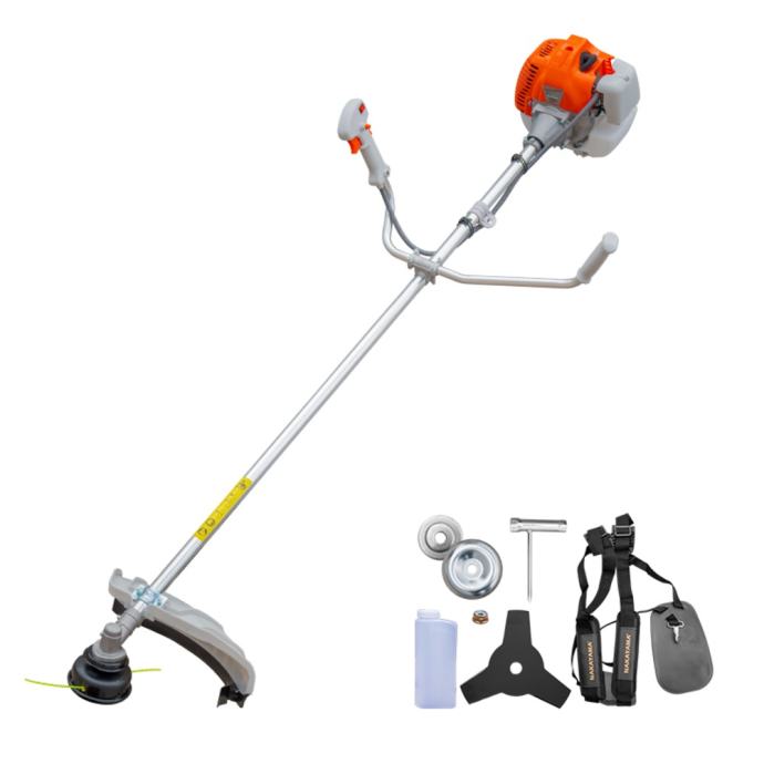 Snažni benzinski trimer može se pohvaliti dvotaktnim motorom, a prijenos snage odvija se putem čelične osovine. Poluautomatska glava i nož s 3 zuba za rezanje grmlja, jačih biljaka i korova. Opremljen je s dvostrukom ručkom, što omogućuje dulji rad, a dvodimenzionalni remen olakšava ruke prilikom rada. Zahvaljujući jednodijelnoj ručki, proizvod je profesionalno krut. Trimer je također namijenjen za košnju većih površina, posebno brdovitih terena i voćnjaka i vinograda. Proizvod se isporučuje u dvije kutije (prva je motor, a druga osovina).