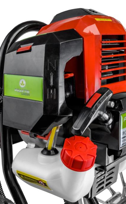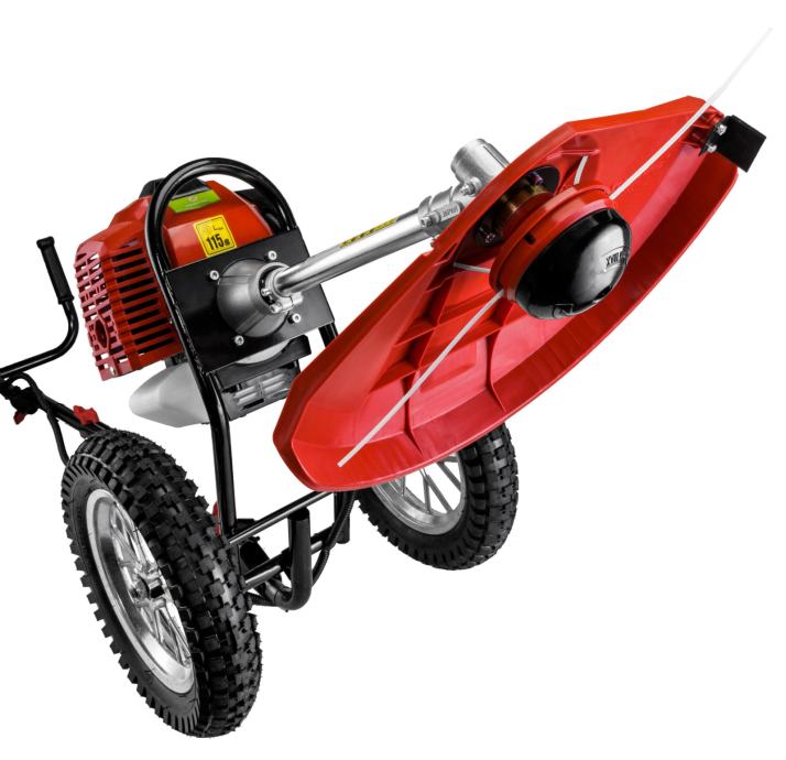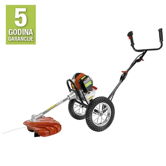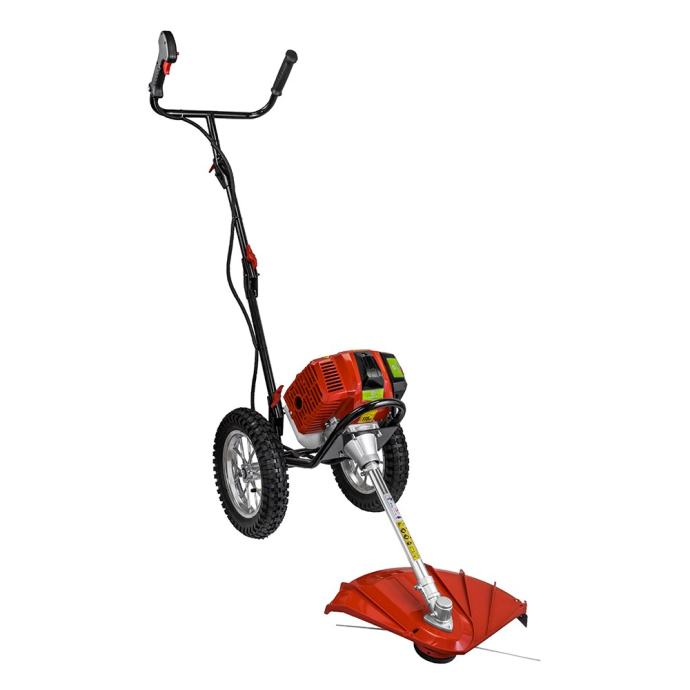 Benzinski motorni trimer na kotačima, vrlo je učinkovit i snažan te je pogodan za uređenje svih vrsta travnatih površina, kako ravnih tako i brdovitih. Bez obzira da li se radi o površinama s višom travom ili zapuštenom travnjaku. To je zapravo spoj trimera i kosilice. Obzirom da je sva težina trimera oslonjena na kotače fizički napor prilikom rada je značajno smanjen. Kotači su velikog promjera tako da trimer sa lakoćom prelazi preko svih neravnina na travnjaku. Izbalansirana konstrukcija olakšava guranje i okretanje trimera. Glava flaksa visoke je kvalitete s niti od 3mm koja se odreže na odgovarajuću veličinu i jednostavno ugura u glavu. Stop prekidač i ručica gasa nalazi se na glavnoj ručki. Nakon rada stroj je moguće sklopiti tako da zauzima malo mjesta prilikom skladištenja. Paljenje trimera vrši se s poteznim startnim mehanizmom. Trimer je opremljen velikim štitnikom koji osigurava siguran rad i u velikoj mjeri smanjuje opasnost da neko strano tijelo dođe u dodir s korisnikom.