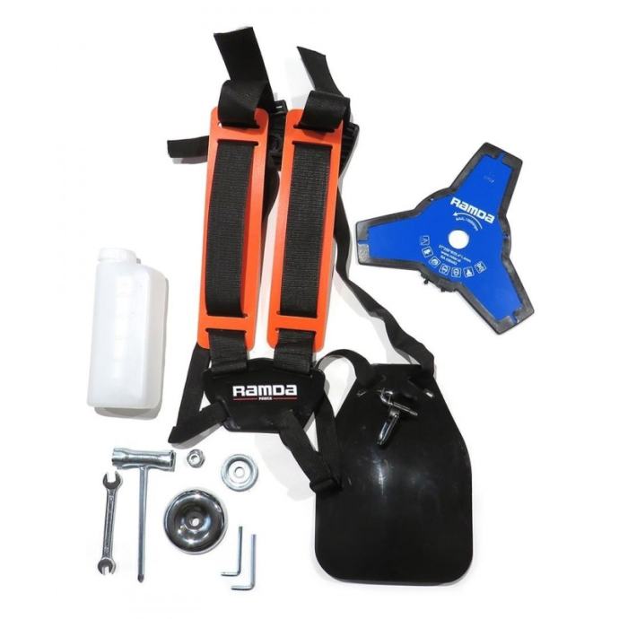 Motorni trimer RAMDA, poluprofesijonalni, s ravnom deljivom osovinom i dvoručnom ručkom.