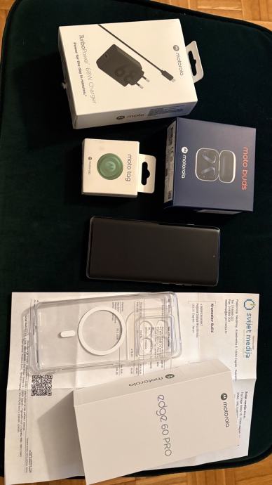 Motorola Edge 60 pro, 8/256 MB, zelena varijanta, kupljena krajem veljače ove godine u Svijetu medija. Na poklon dobiveni punjač, slušalice i Motorola Tag. Prodaje se kao komplet. Na ekranu zaštitna folija iz Platinum Outfitersa, kao i zaštitna maskica, original i jedna sa magnetom kao magsafe.