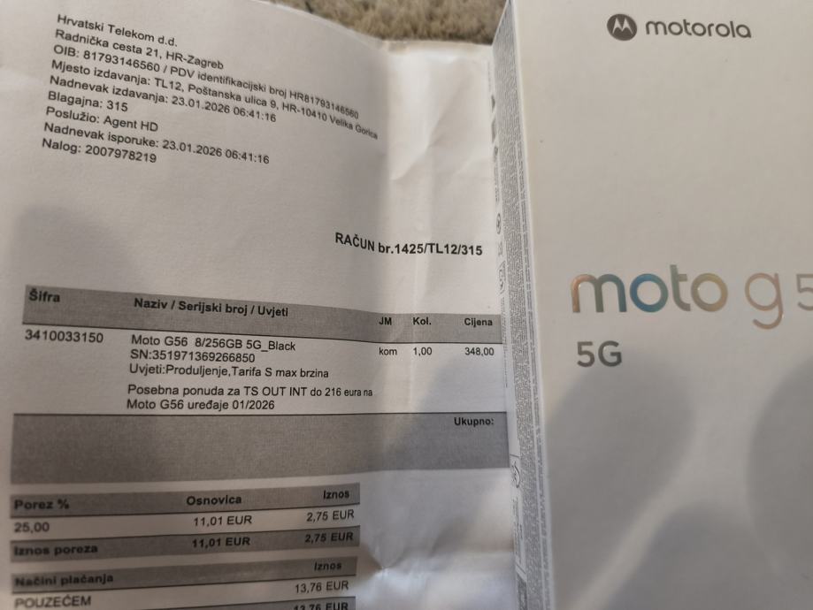 Prodajem novi nekorišteni mobitel Motorola moto g56 5G dobiven u hrvatskom telekomu zbog produljenja ugovora. Nov, neraspakiran. Memorija 256G.