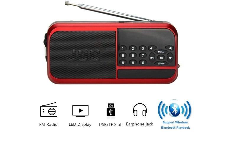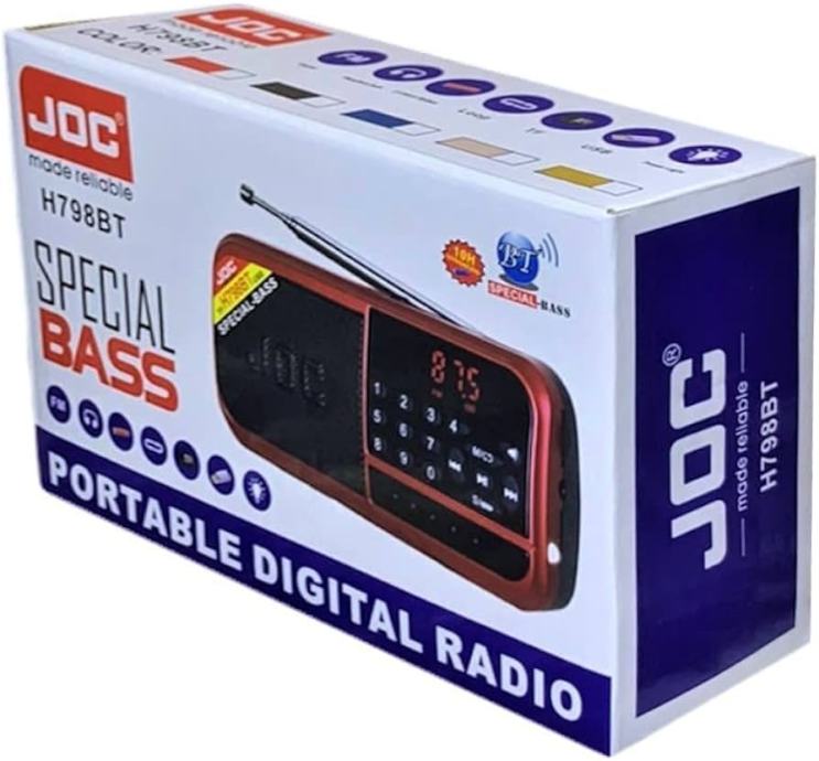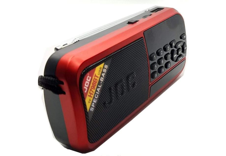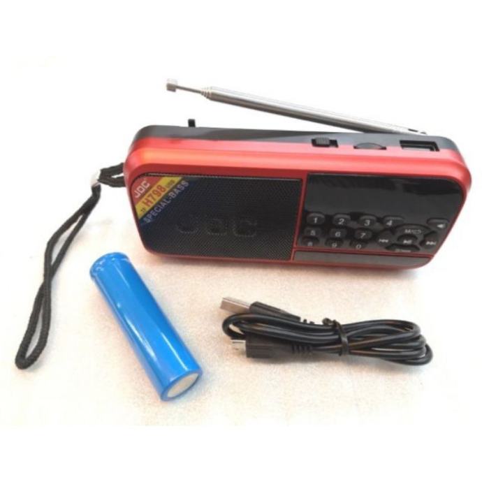 Multifunkcijski prijenosni digitalni FM radio mp3 USB JOC H798BT Rechargeable, tranzistor, MP3 player, čisto i glasno prima sve radio postaje, bluetooth funkcija za reprodukciju glazbe putem mobitela, za napajanje koristi vlastitu Li-ion punjivu bateriju tipa 18650 koja je priložena, radio se puni putem kabla na svokom USB konektoru, ima utičnicu za slušalice 3,5mm i utičnicu za napajanje 5V,