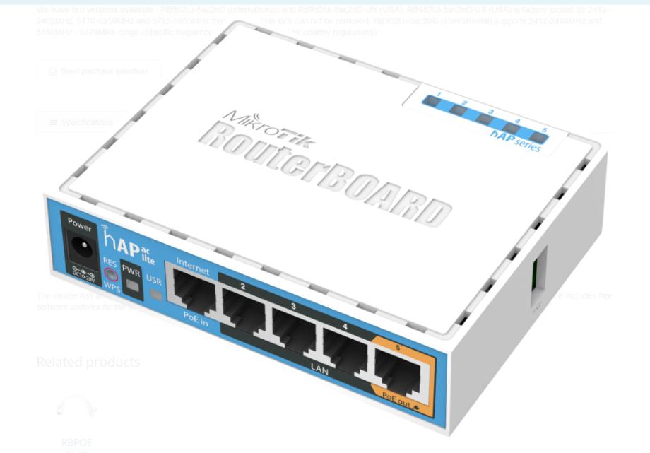 Mikrotik hAP ac lite (RB952Ui-5ac2nD-TC) je kompaktan i univerzalan bežični usmjerivač namijenjen za kućne i male poslovne mreže. Ovaj uređaj nudi dvostruku istodobnu pristupnu točku (dual-concurrent access point) koja omogućuje bežičnu vezu na 2,4 GHz i 5 GHz frekvencijama istovremeno, čime pokriva širok raspon uređaja i aplikacija.