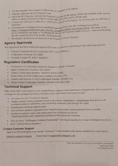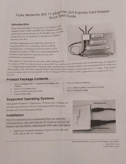The adapter supports 3 x 3 MIMO configuration and 80 MHz channel widths allowing users to deploy and troubleshoot WiFi networks delivering performance at data rates up to 1300 Mbps.The PCI Express Card Adapter is an 802.11ac compliant wireless adapter for your Windows PC with an available Mini PCI Express slot (34mm). The adapter us built with the Broadcom BCM943460MC using 3Tx/3Rx MIMO architecture, and includes three monopole dual-band reverse polarity SMA antennas. The adapter has been optimized for use with the AirMagnet tools for efficient and accurate 802.11ac testing and troubleshooting.