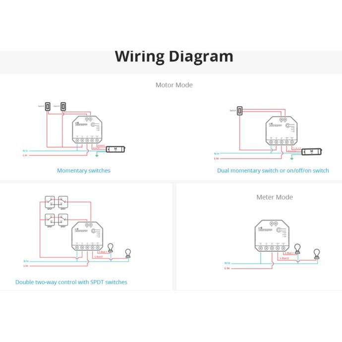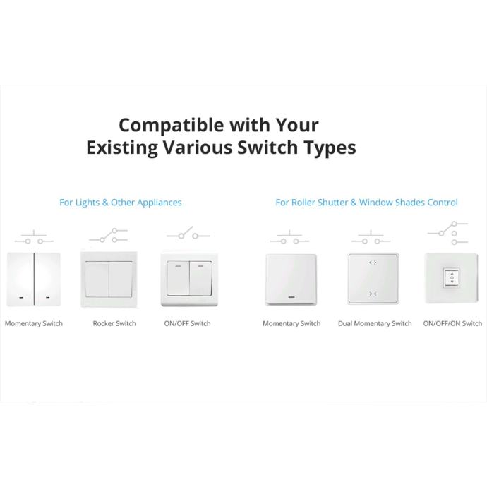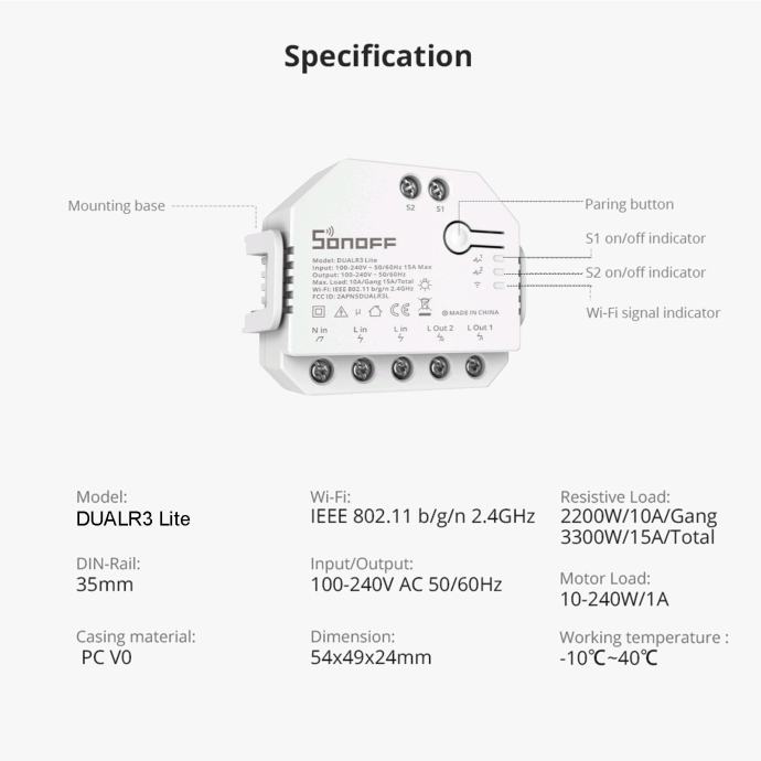 DUALR3 Lite je podžbukni Wi-Fi pametni modul s dvostrukim relejem koji se instalira iza bilo kojeg standardnog prekidača za prijenos u pametni prekidač za bežično daljinsko upravljanje s mobilnim uređajima ili glasovnim naredbama. Objedinjavanje vaših kućanskih uređaja u integriranu bežičnu mrežu kako bi međusobno komunicirali što vam je zgodno za upravljanje i kontrolu, uključujući svjetla, kućanske uređaje i motorizirane objekte kao što su rolete, sjenila za prozore, sjenila, tende itd.